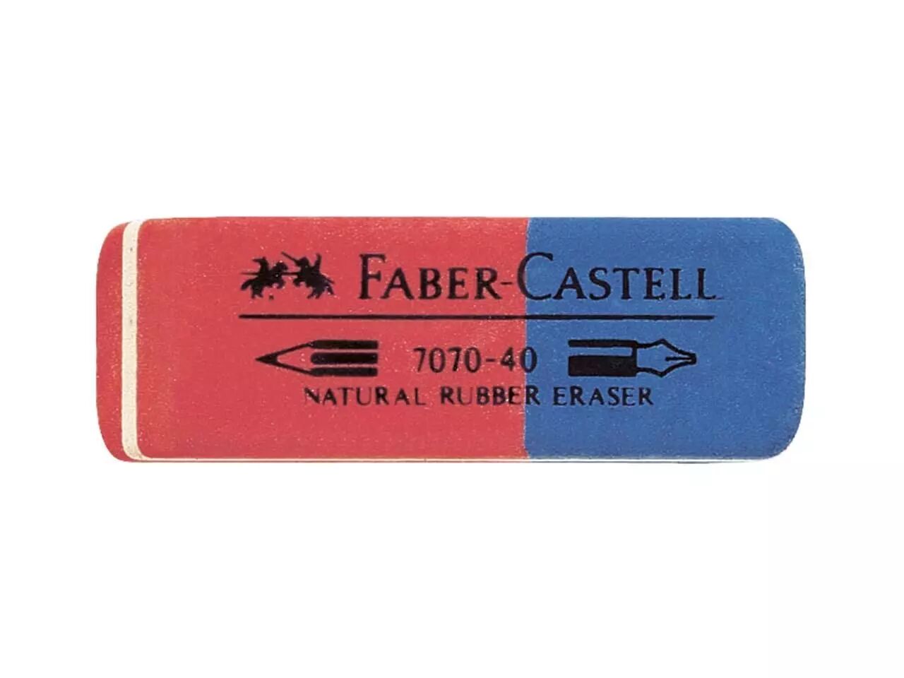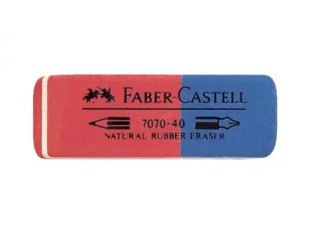 Ce classique est de retour ! La gomme pur caoutchouc avec 2 couleurs : la partie rouge pour les crayons à mine graphite, la partie bleue contenant de la poudre de pierre ponce pour les stylos à bille et à encre. Dimensions : L74 x P24 x H10 mm.