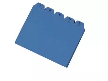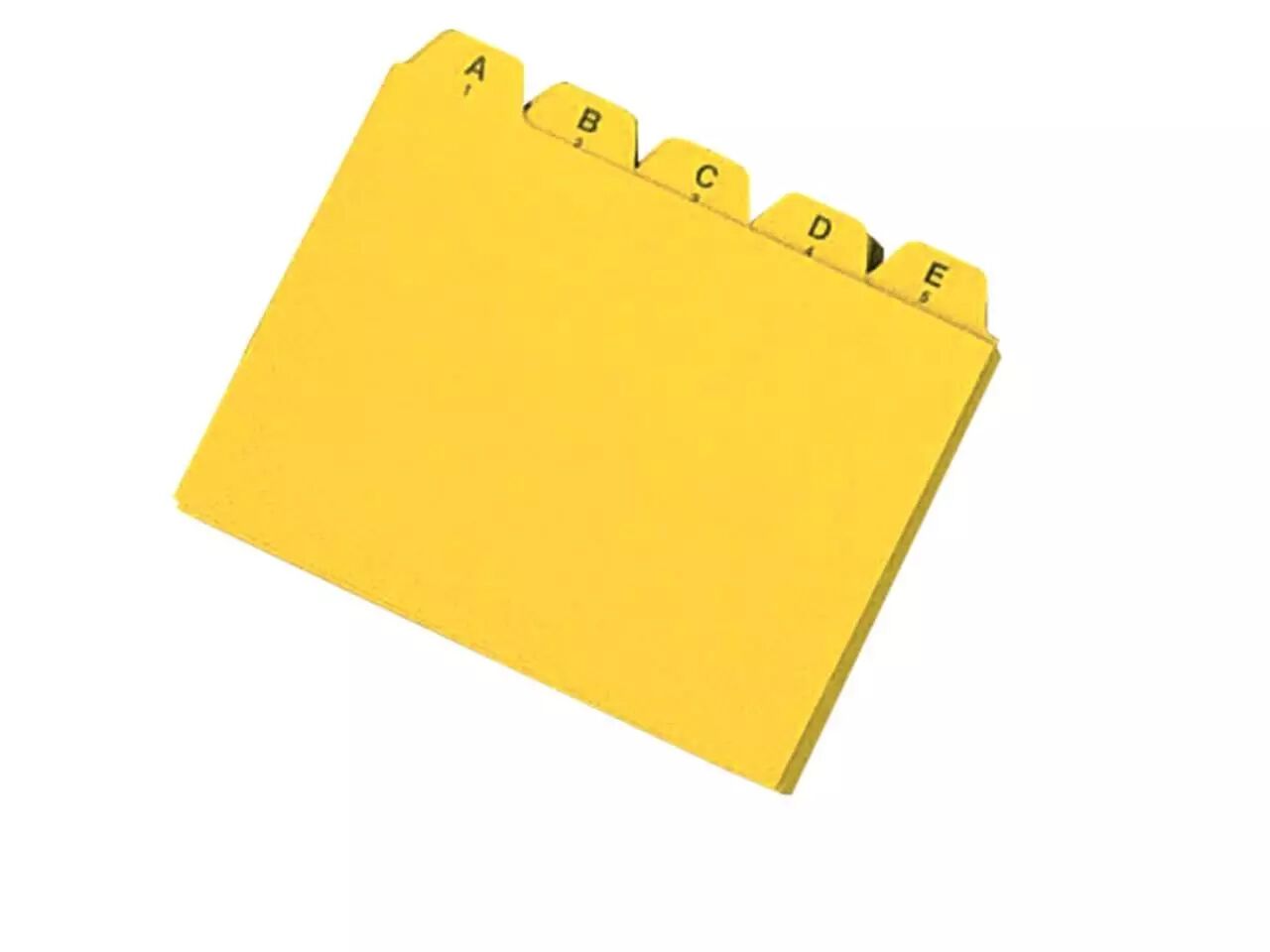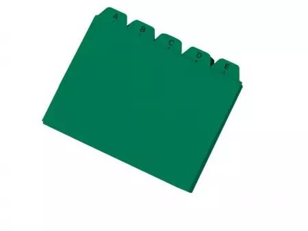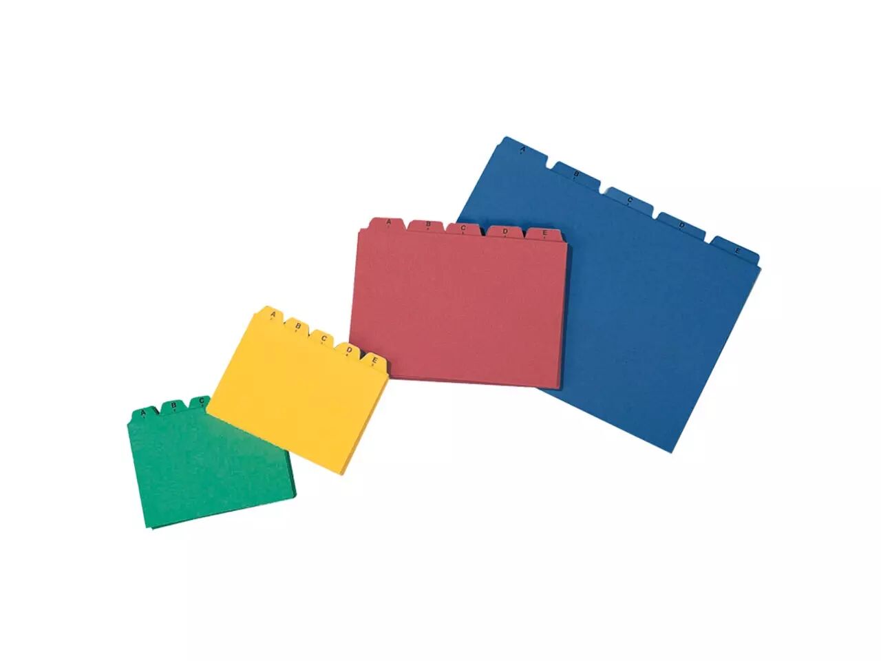 Lot de 25 intercalaires, pour un classement alphabétique de A à Z. Cinq onglets visibles de front (soit 5 rangées d'onglets au total pour les 25 positions). Intercalaires en carton recyclé 100 % (label écologique «Ange Bleu»), de qualité et très robustes 265 g/m². Emballage polyéthylène.