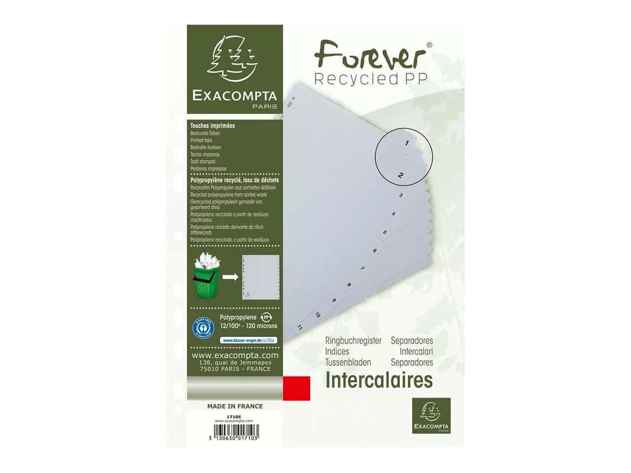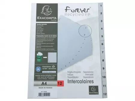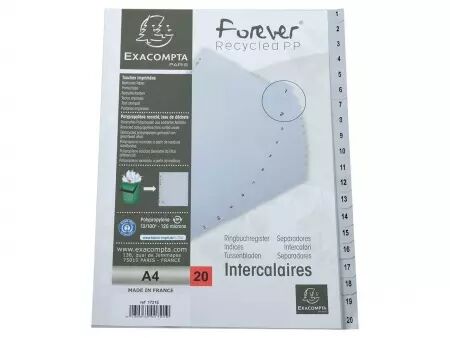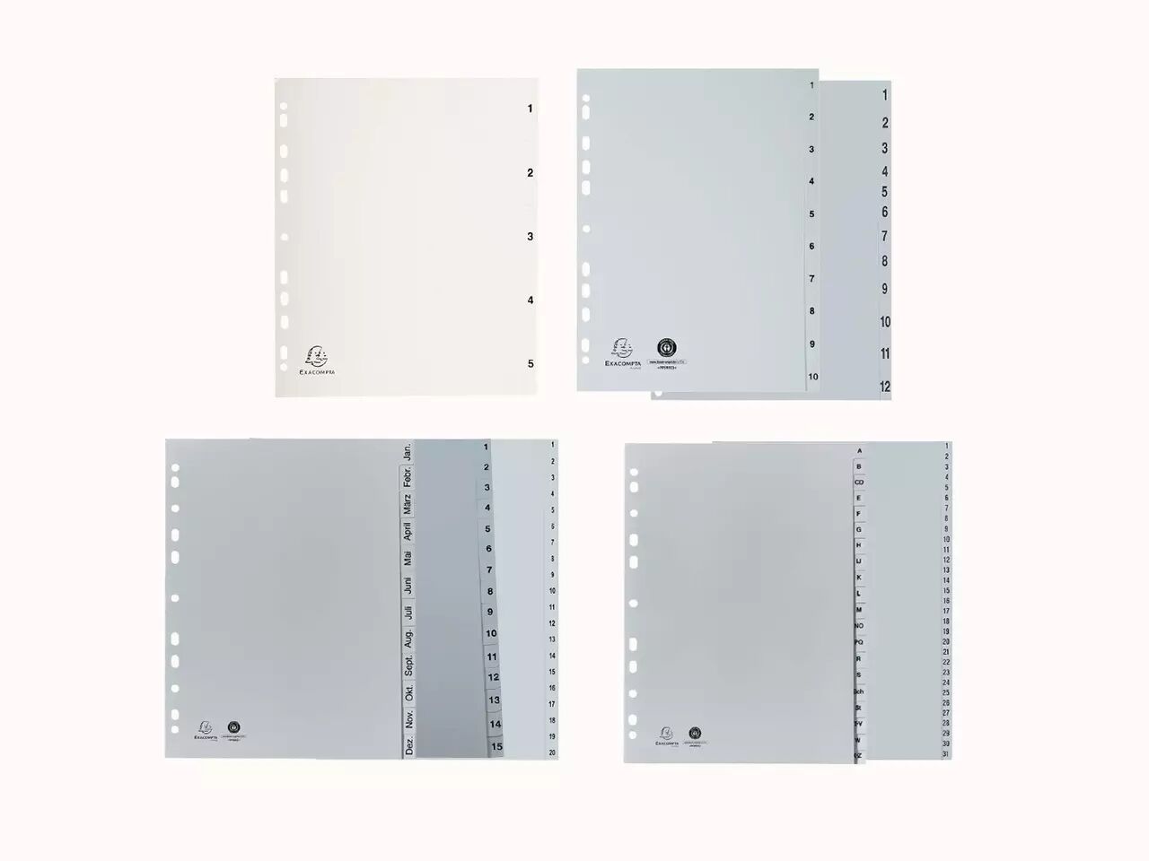 Ces intercalaires en PP recyclé sont parfaits pour classer ses documents dans les classeurs à levier et classeurs à anneaux, tout en ayant instantanément une vue d'ensemble de leur contenu. Indéchirables avec leur épaisseur de 120 µ, ils conviennent à tous les classeurs grâce à la perforation universelle. En plus des intercalaires imprimés, une page de sommaire est fournie : elle permet de récapituler le contenu.
