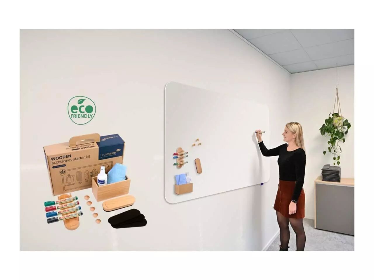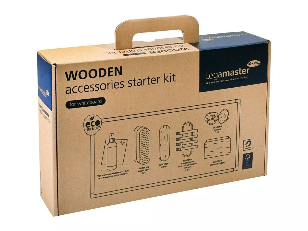 Le set pour tableaux blancs WOODEN contient tout ce dont on a besoin pour une présentation réussie. Il comprend une brosse pour tableau blanc avec 3 patins interchangeables, un porte-accessoires ainsi qu'un porte-marqueur, 5 aimants, 4 marqueurs pour tableau blanc Ecoline de chez Edding, un nettoyant pour tableau blanc de 125 ml ainsi qu'un chiffon en microfibres (40 x 40 cm). Les produits sont adaptés à une utilisation sur les tableaux blanc magnétiques. Toutes les pièces en bois sont en hêtre laqué, certifié FSC® et issu de forêts gérées durablement. Le set est placé dans une boîte en carton pratique dans laquelle les accessoires peuvent être rangés. Grâce à sa poignée, le set peut ainsi être emporté à chaque séminaire, réunion, etc.
