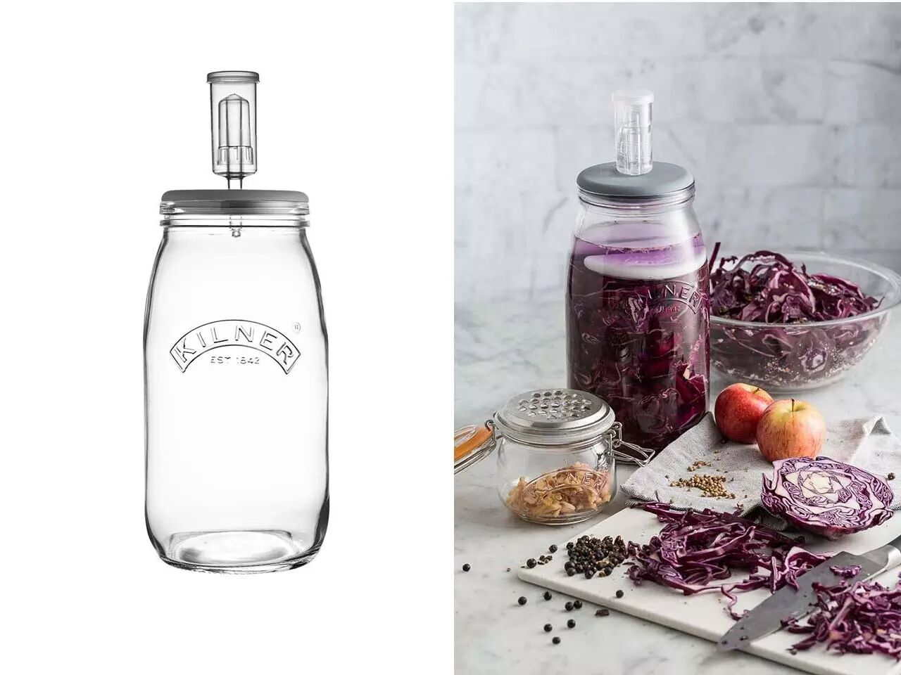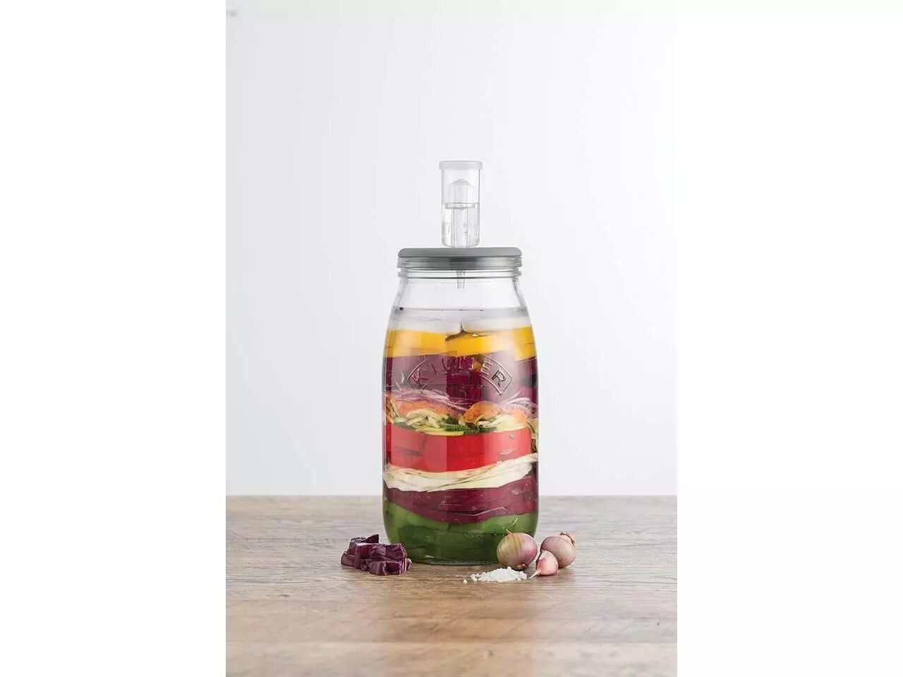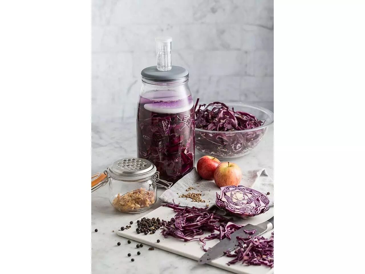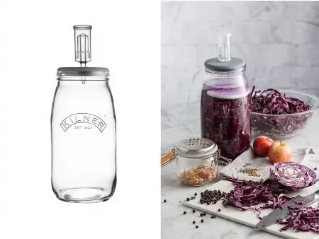 Avec ce kit de lacto-fermentation KILNER, chaque légume peut être conservé et sublimé de manière totalement naturelle, qu'il s'agisse d'ail aromatique, de choucroute traditionnelle ou de kimchi coréen faits maison. Le bocal est en verre et les deux demi-lunes qui l'accompagnent sont en céramique. Ce kit est sans bisphénol A (BPA). La fermentation permet de conserver les légumes très longtemps et, contrairement à la mise en conserve, elle préserve les vitamines et les nutriments importants. En outre, au cours du processus naturel de fermentation, des cultures probiotiques se développent. Ces probiotiques favorisent une flore intestinale saine. Les gaz produits peuvent s'échapper par la valve fixée au couvercle hermétique en silicone, qui empêche toutefois l'oxygène et les germes d'entrer. La fraîcheur de vos légumes est ainsi garantie?! La fermentation donne aux aliments un goût légèrement acide, qui prend une saveur unique en fonction des herbes et des épices que vous y ajoutez. Capacité de 3 l.
