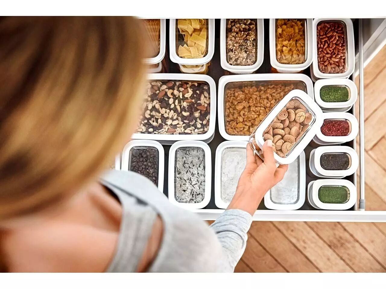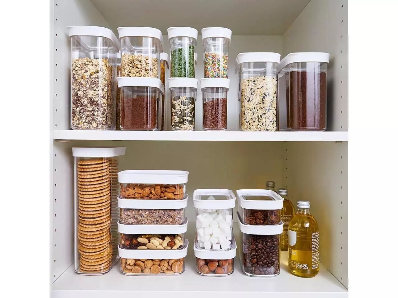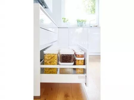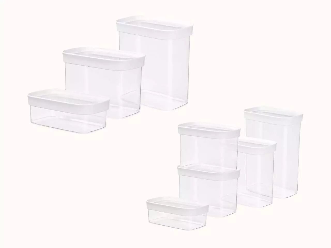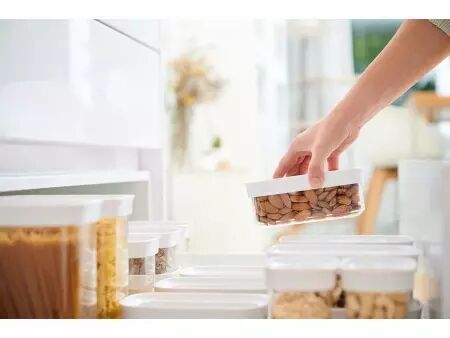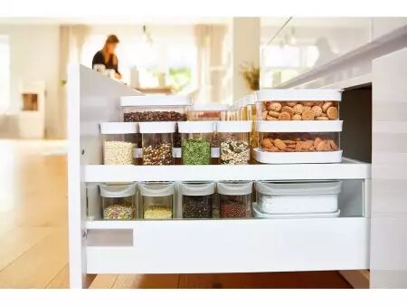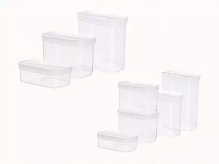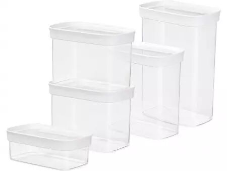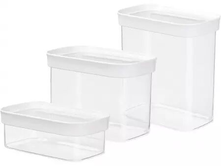 Voici un lot de boîtes empilables avec fermeture hermétique qui vous permettera de stocker au sec votre épicerie comme les noix, de la farine, des pâtes ou du riz. Les boîtes de rangement de différentes tailles vous aideront à bien ordonner vos placards de cuisine. Elles protègent vos denrées de l'humidité et des parasites. Pour une meilleure visibilité des contenus, les boîtes sont transparentes et fabriquées à partir d'un matériau durable de haute qualité compatible avec un passage au lave-vaisselle (panier du haut). Contenu lot de 5 : 1 x 0,45 l, 2 x 1 l, 1 x 1,6 l, 1 x 2,2 l | Contenu lot de 3 : 0,45 l/1 l/1,6 l