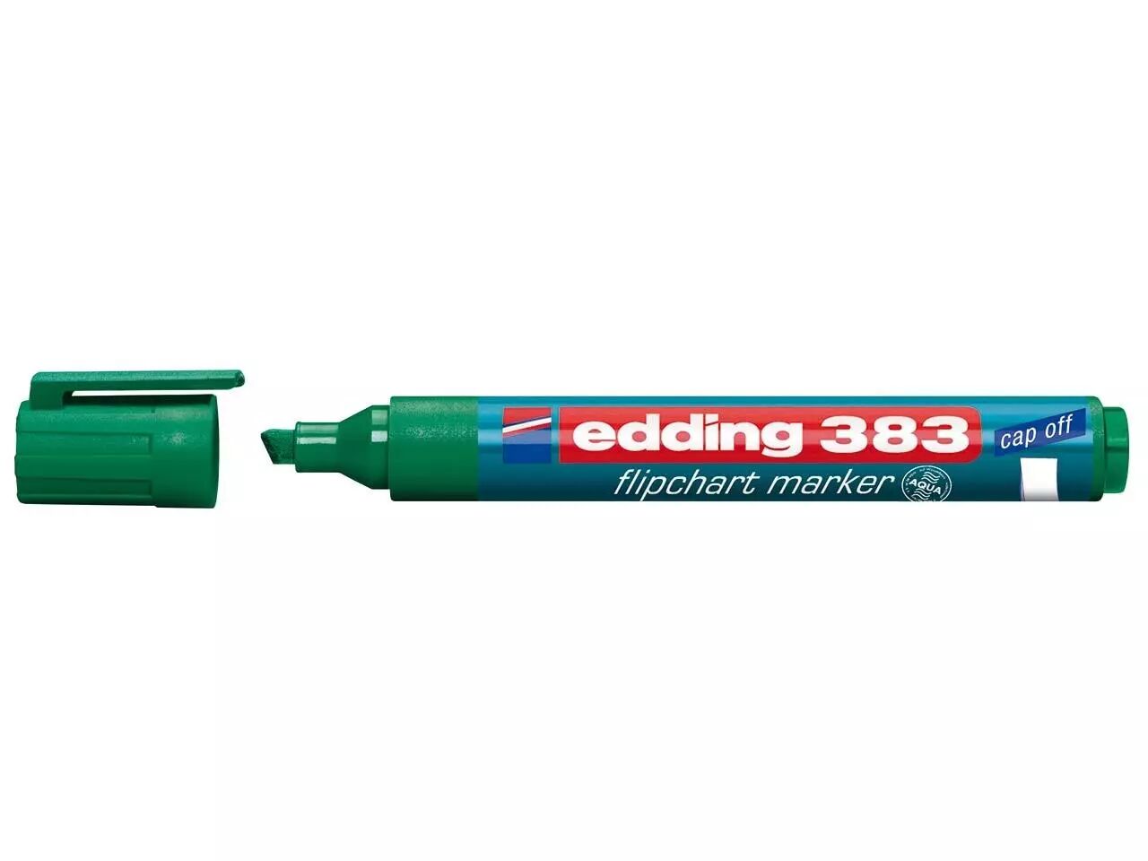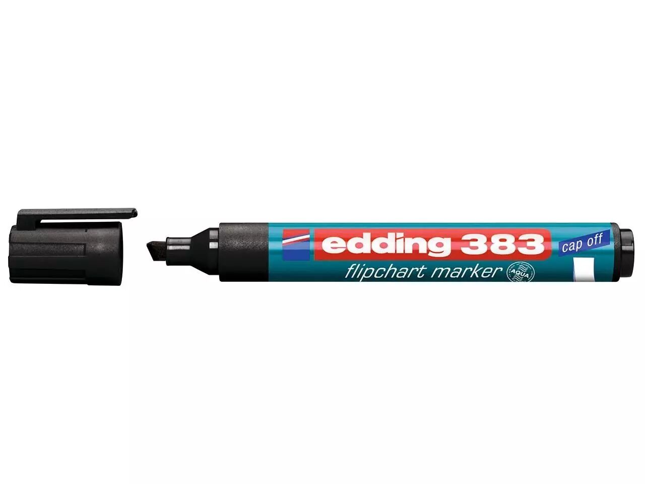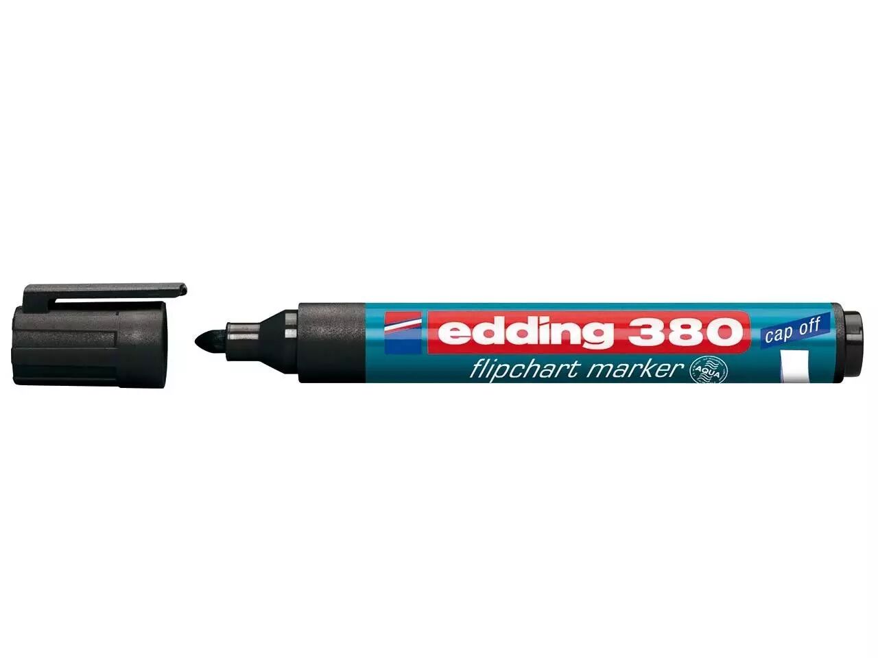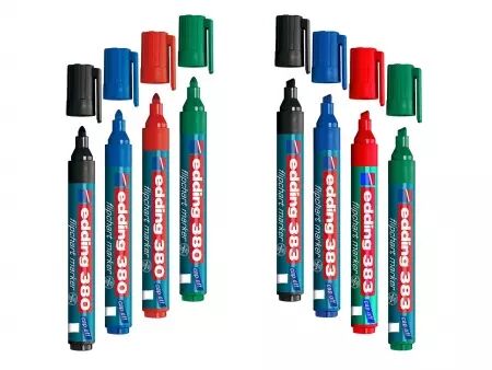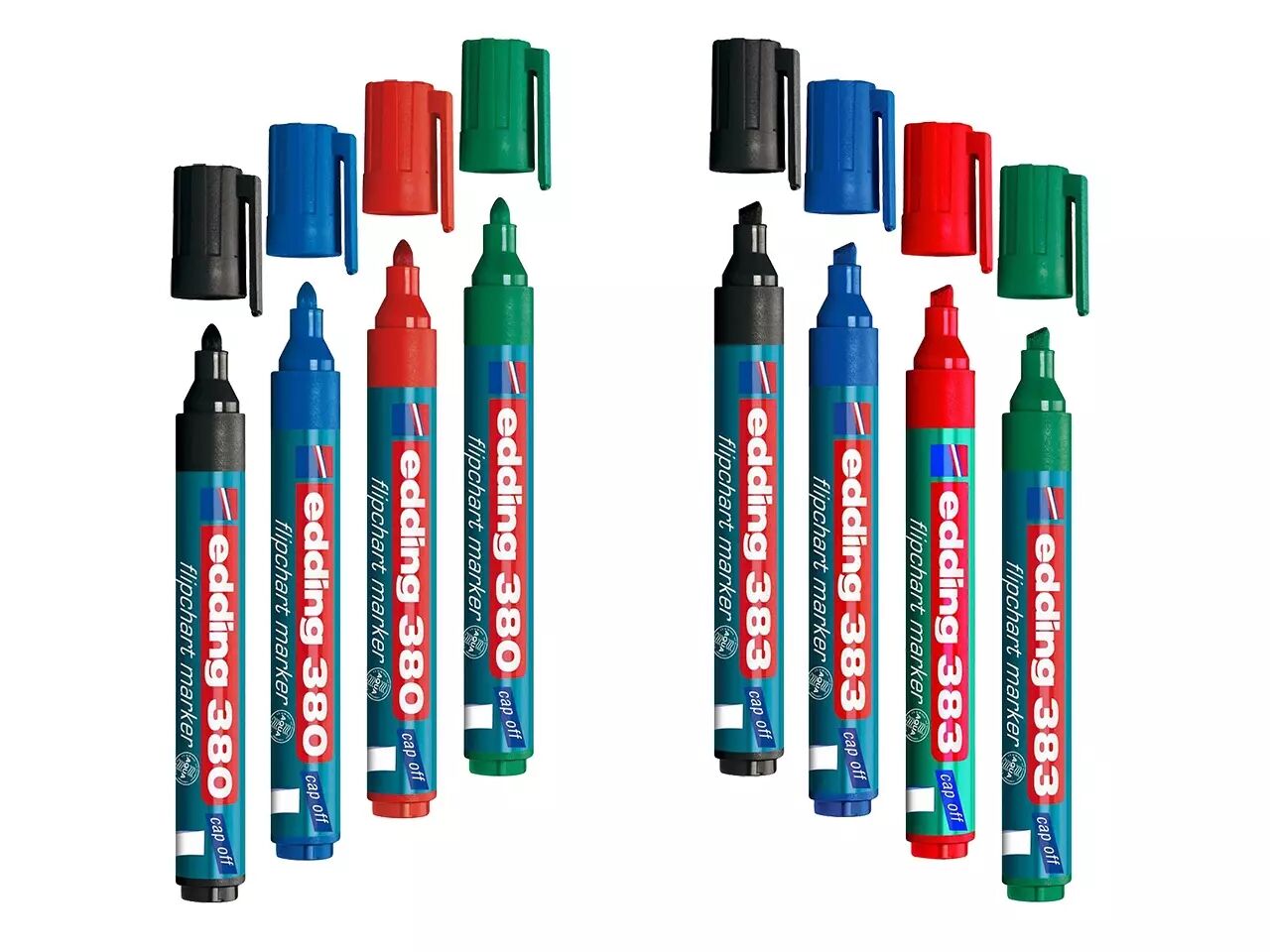 Les marqueurs pour paper board Edding 380 et 383 sont rechargeables. Leur encre à base d'eau ne traverse pas les pages suivantes. Leur technologie "cap-off" permet à la pointe de ne pas sécher même sans capuchon durant plusieurs semaines. Ne convient pas au métal et aux tableaux blancs.