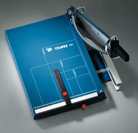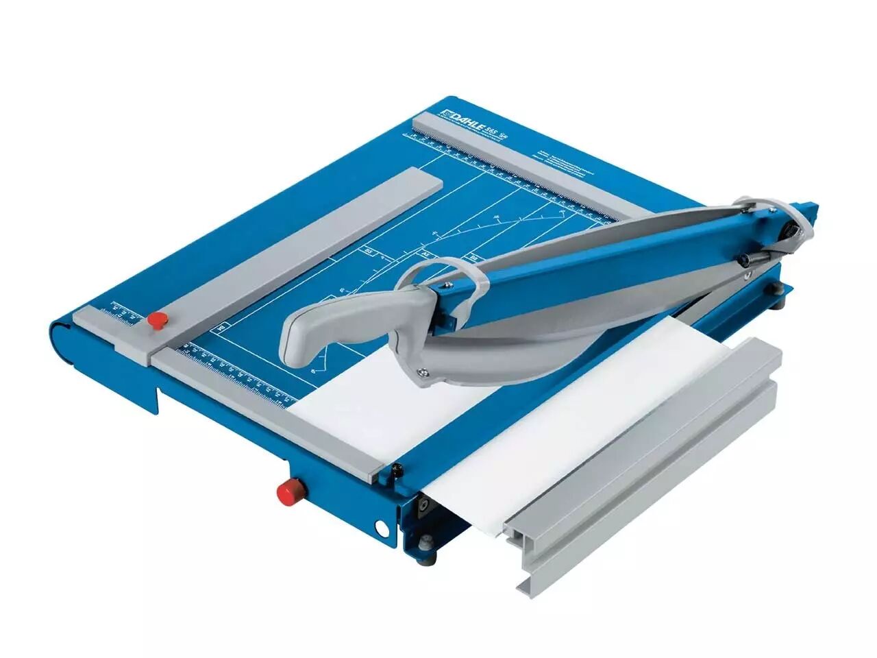 Massicot de bureau Dahle haute protection avec système de cache lame automatique pendant la coupe, table de coupe en acier, poignée et protection en plastique ABS. Butée latérale de coupe réglable pour une précision de coupe optimale.
