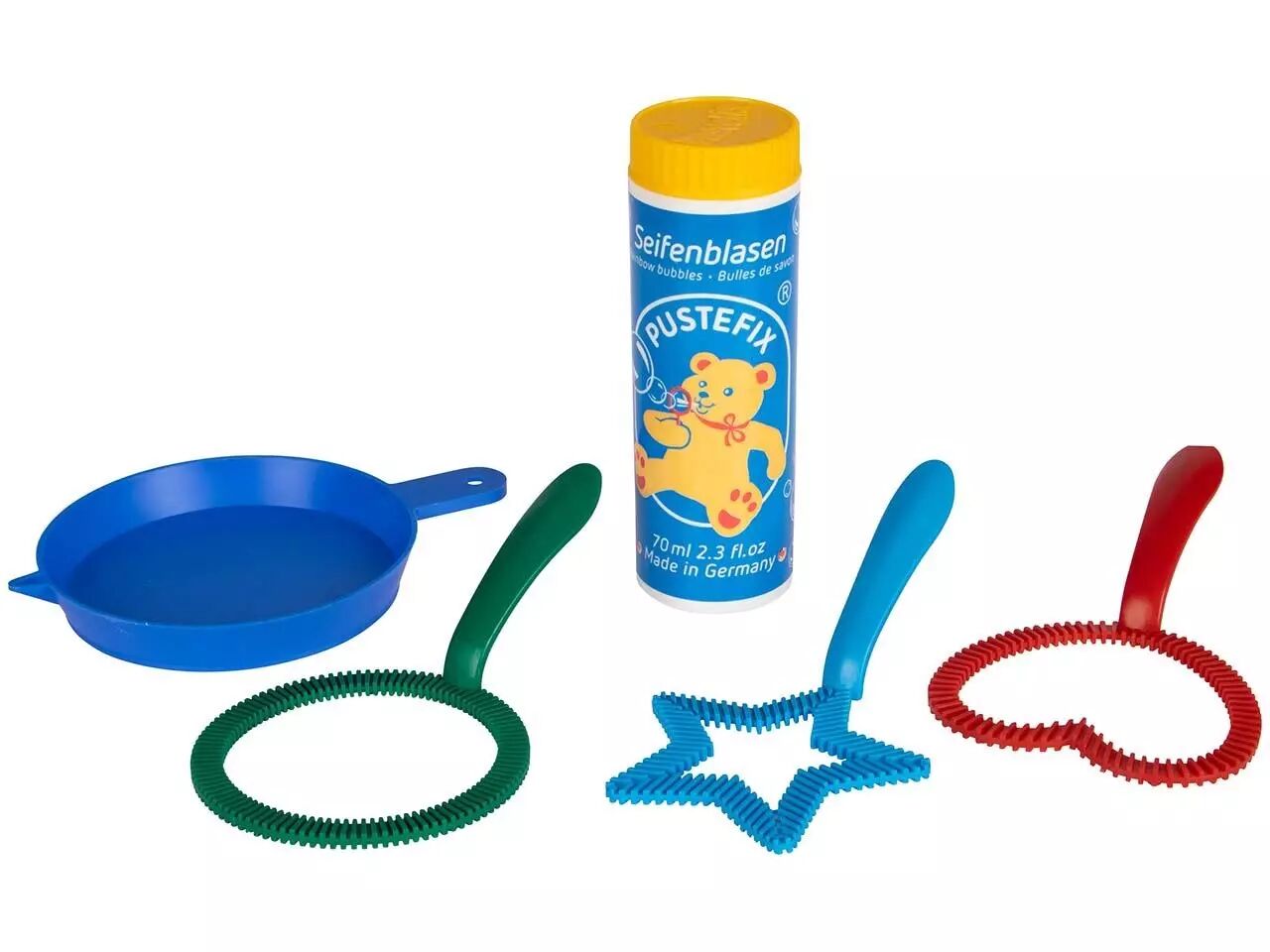Ce petit kit pour souffler des bulles de savons contient 3 anneaux en forme de cœur, cercle et étoile, une bouteille de produit à bulles de savon Pustefix de 70 ml, et une petite soucoupe pour y verser le liquide.