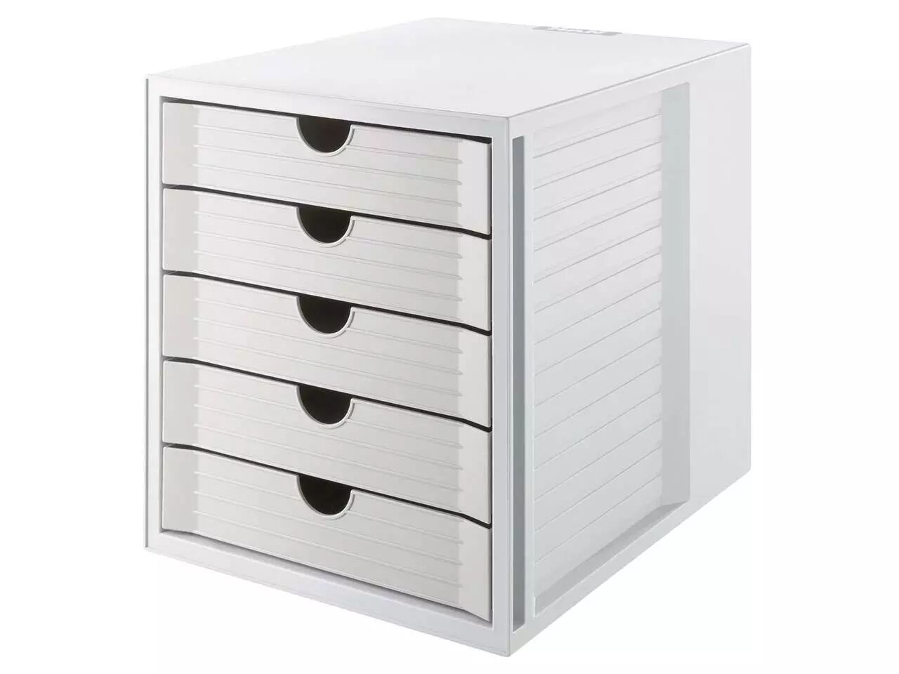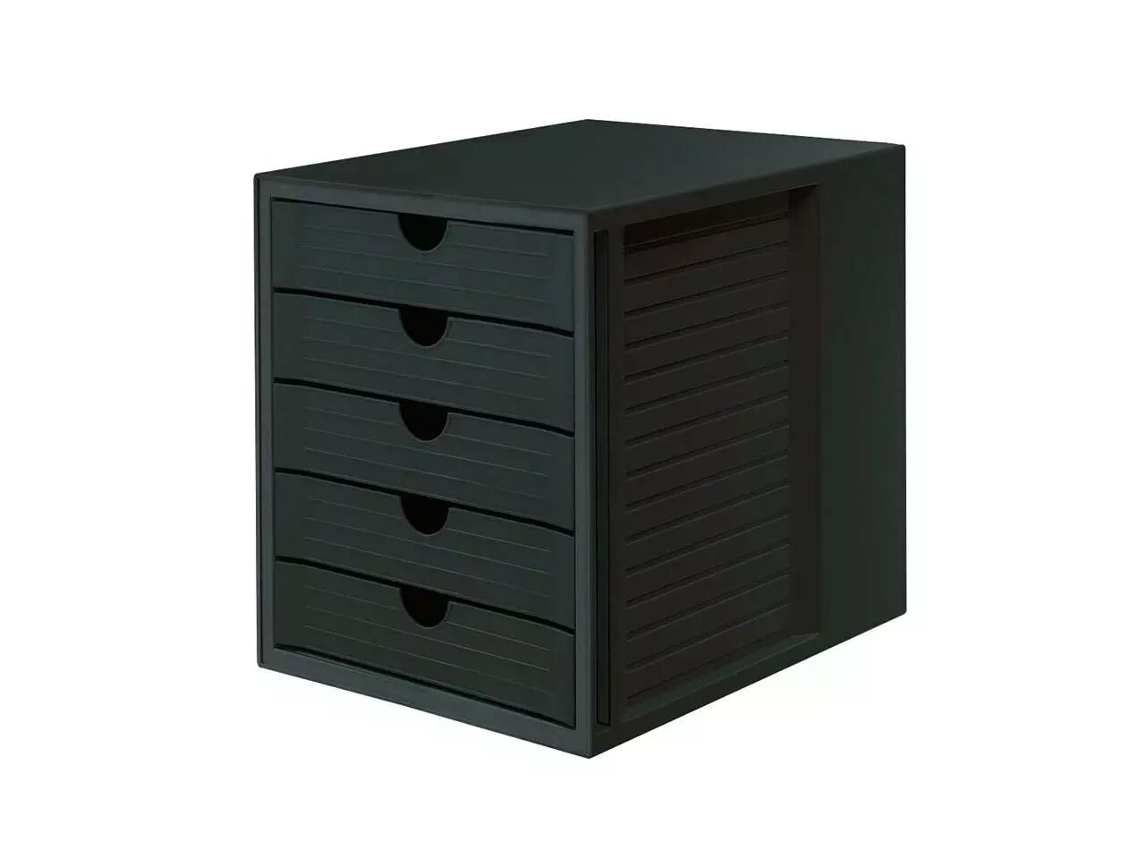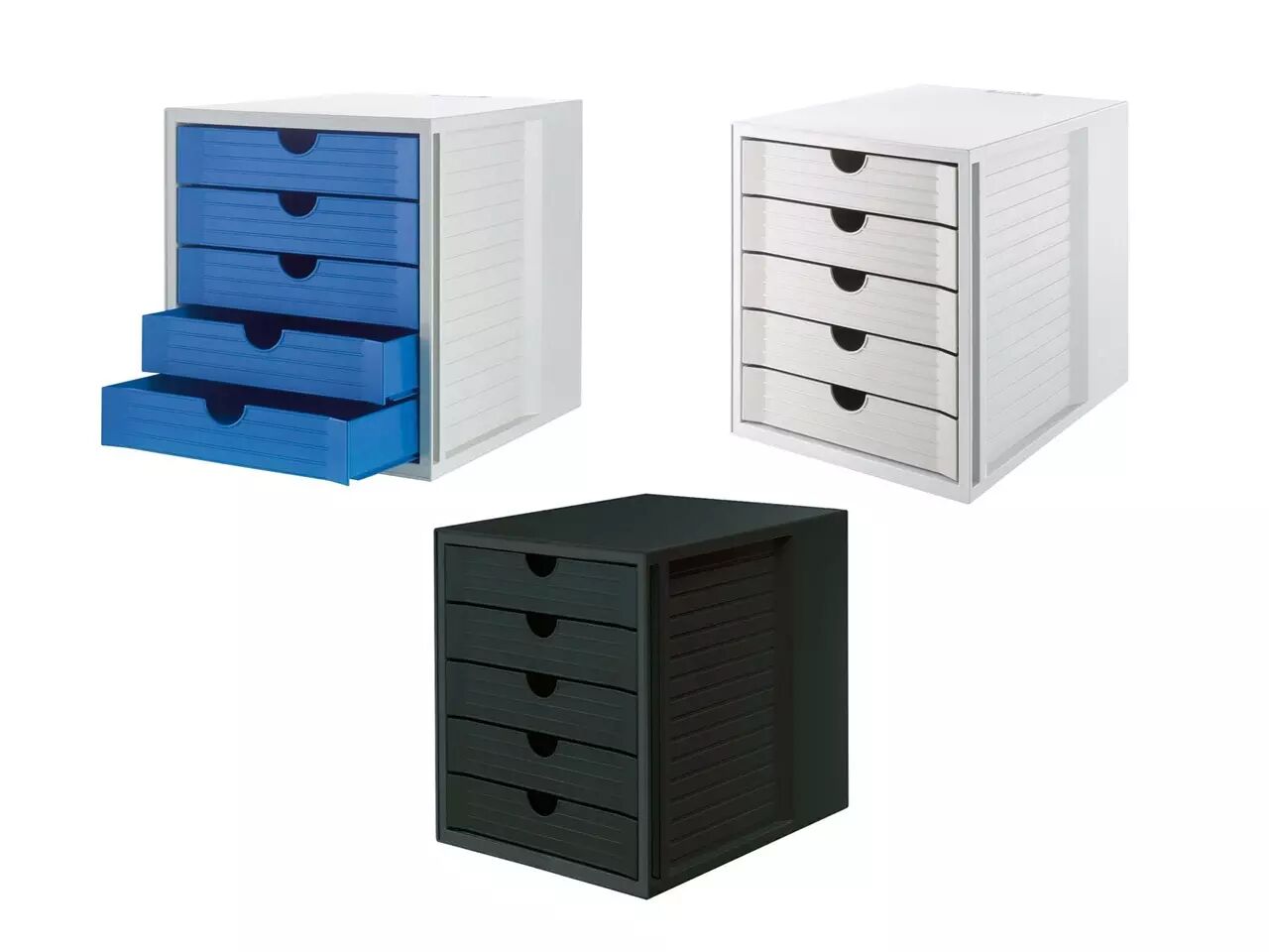 Ce module tient sur les rayons et dans les armoires de bureau normalisées. Corps robuste, cinq tiroirs amovibles, avec butée d'arrêt. Dimensions l 27,5 x p 33 x h 32 cm.