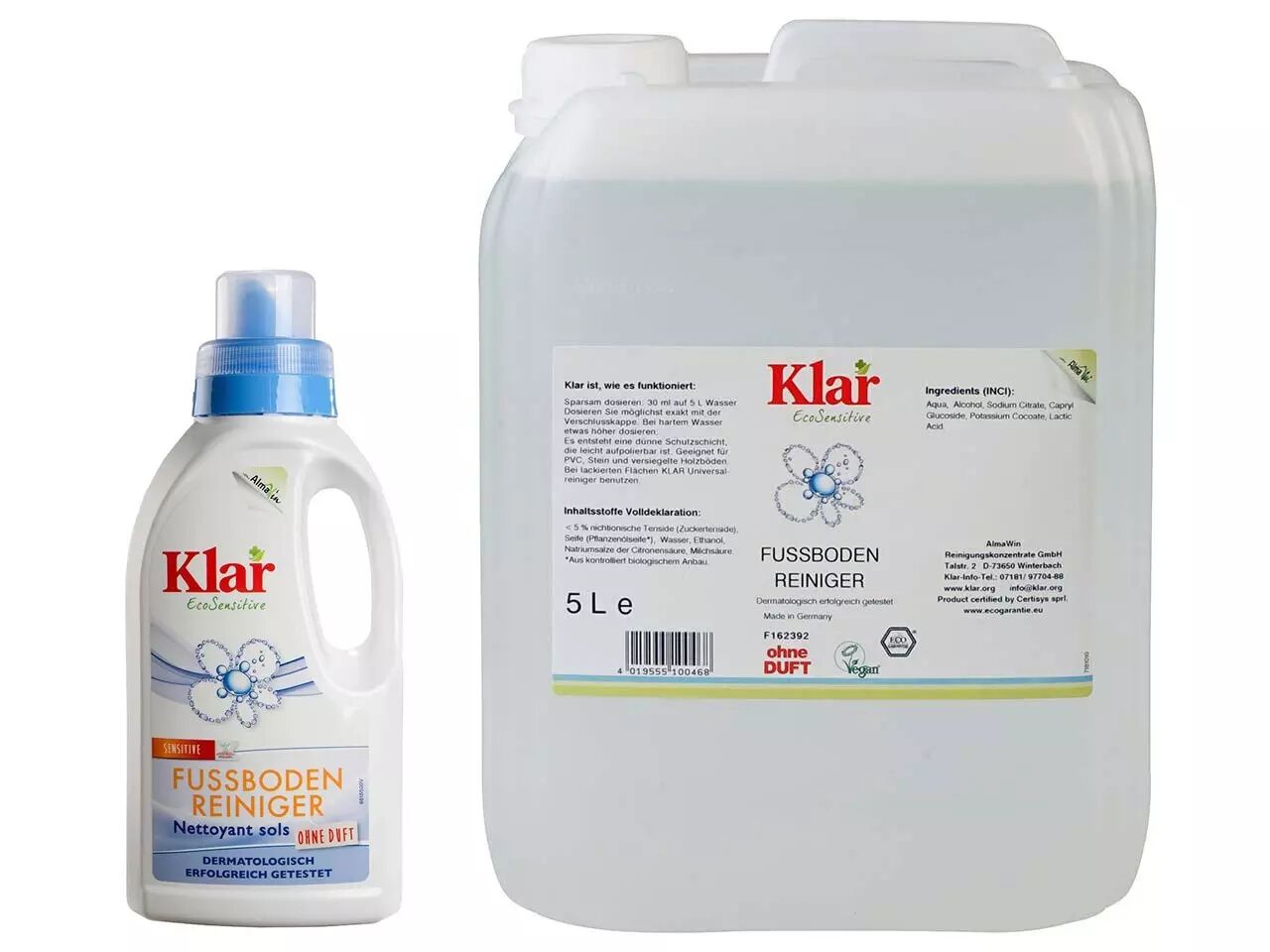 Les produits d'entretien KLAR sont très efficaces tout en préservant l'environnement. Ils ne contiennent aucun tensio-actif difficilement biodégradable (LAS, APEO), et sont seulement élaborés à partir de matières premières renouvelables. Pas de phosphates ou équivalents qui posent problème (EDTA, NTA, phosphates), pas de formadéhyde ni de chlore, ni d'acides anorganiques. Sans colorant, parfum ou conservateur.