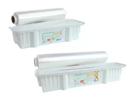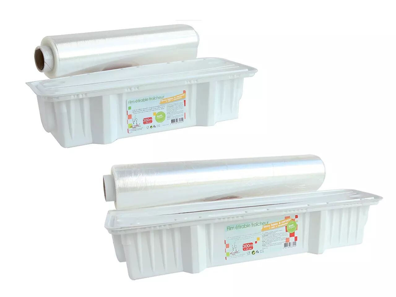 Film étirable alimentaire sans PVC, avec lame de découpe à curseur plus sûr et plus économe.