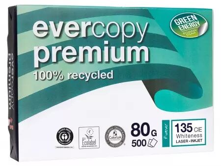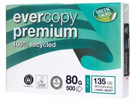 Fabriqué sur le site du groupe Clairefontaine spécialisé dans la production de papiers recyclés, Evercopy Premium est l'un des papiers recyclés les plus performants. Il est fabriqué dans le respect de l'environnement : énergie verte, peu de déchets générés (seulement 6 %), sans désencrage ni traitement au chlore. Sa composition est faite à partir de 100% de papiers de récupération et de vapeur d'origine biomasse. Evercopy Premium est certifié FSC, Ecolabel Européen et bénéficie aussi de l'éco label Ange Bleu.