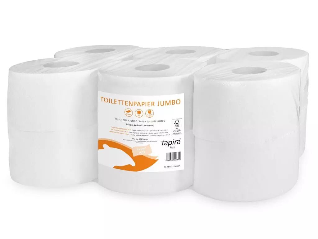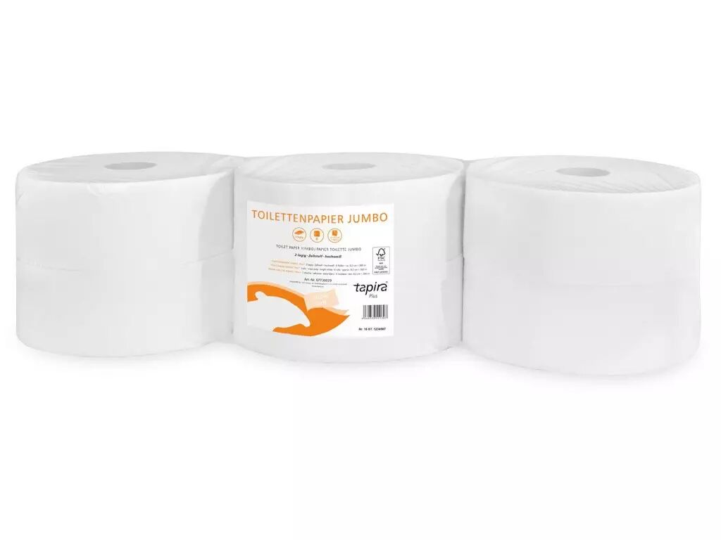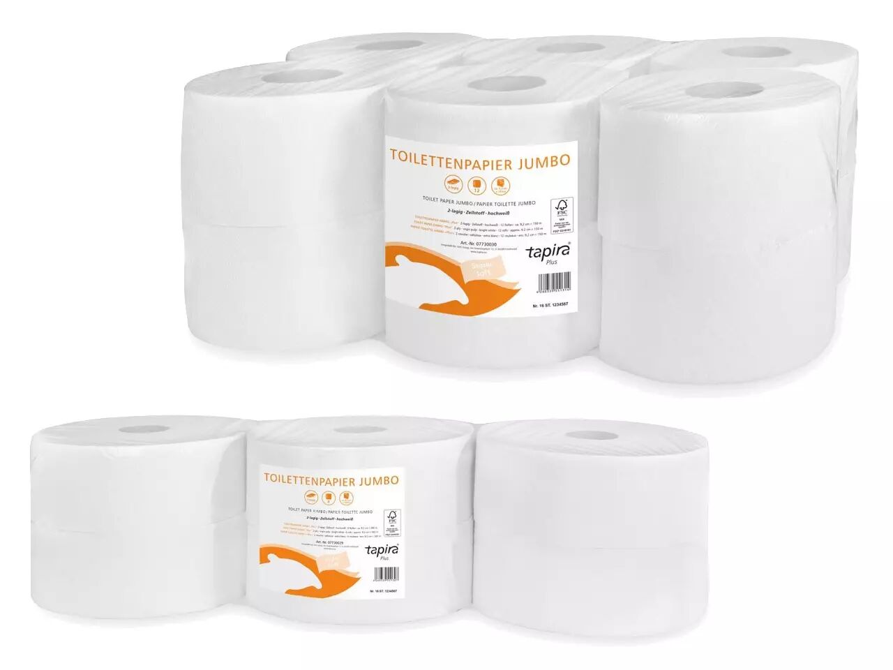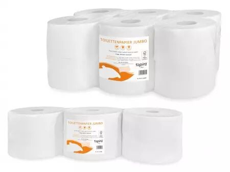 Le diamètre du rouleaux est de 18,5 ou 26 cm selon la référence et le conditionnement est de 6 ou 12 rouleaux. Ce format jumbo est adapté aux distributeurs de collectivités.