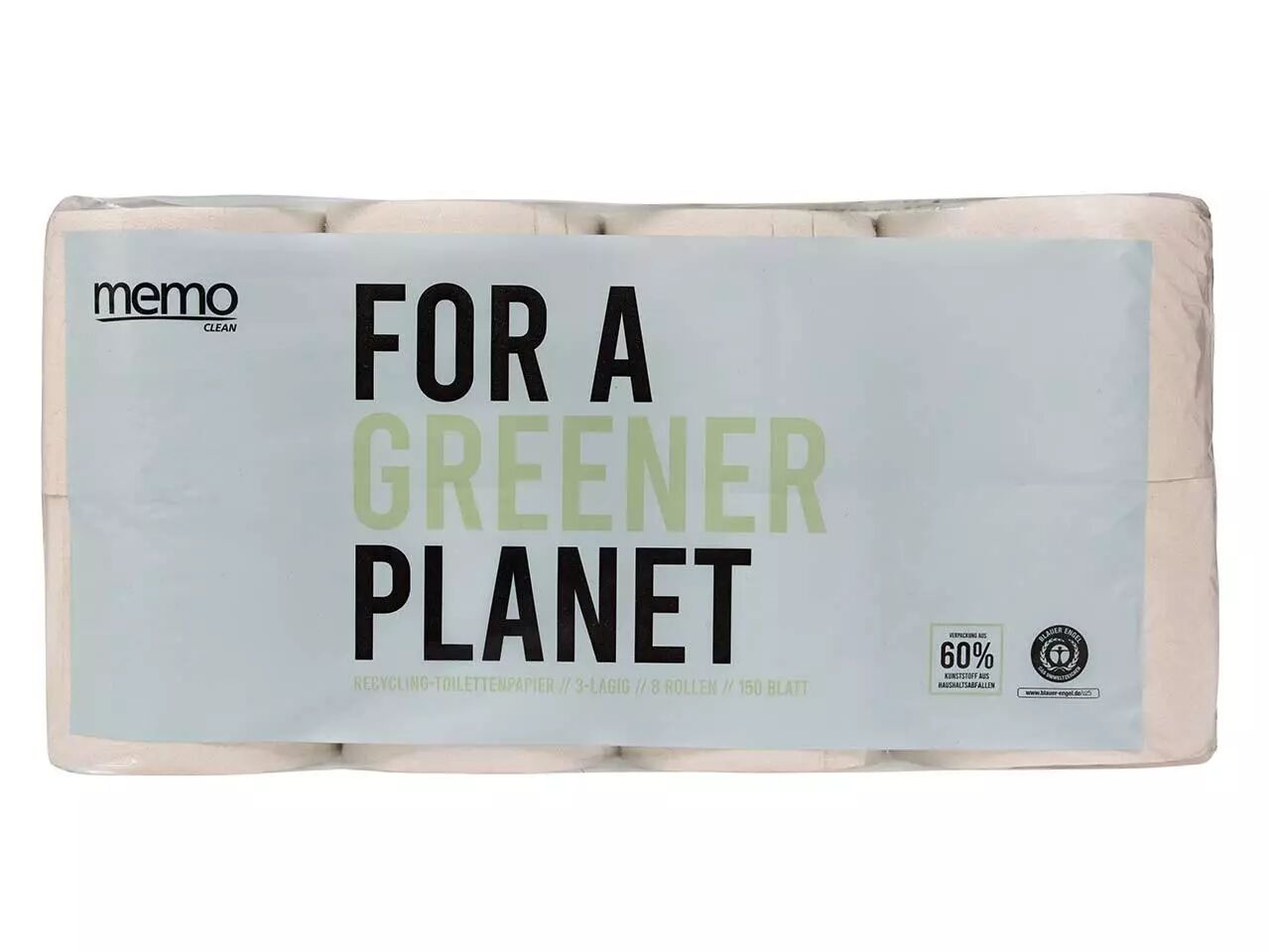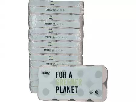 En utilisant ce papier toilette mémo, vous contribuerez à ménager les ressources de notre planète : un beau geste respectueux de l'environnement. Le papier hygiénique triple épaisseurs, agréablement doux, est fabriqué à partir de papier recyclé et bénéficie du label écologique Ange Bleu. Même l'emballage est plus respectueux de l'environnement que de nombreux produits concurrents : son film en plastique recyclé est composé à 60 % de plastique issu de la collecte et tri des déchets ménagers. 150 feuilles par rouleau, en paquets de 8 rouleaux.