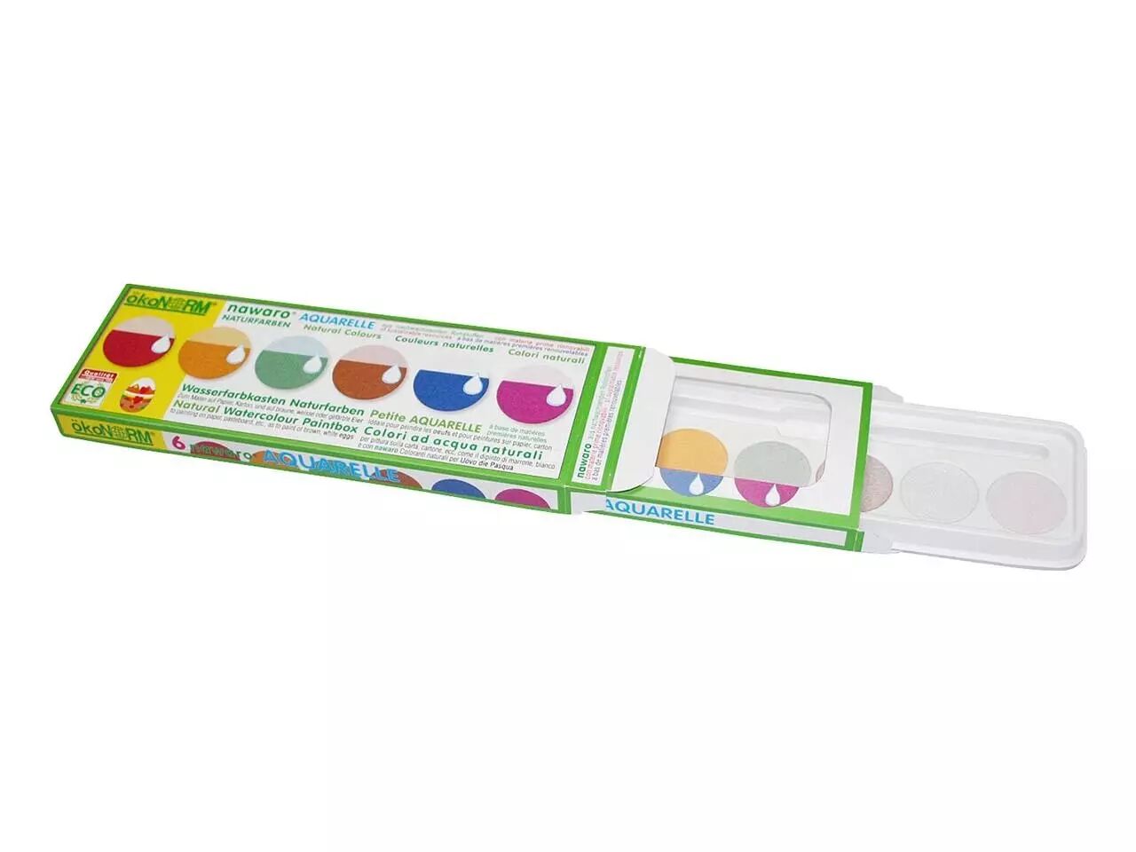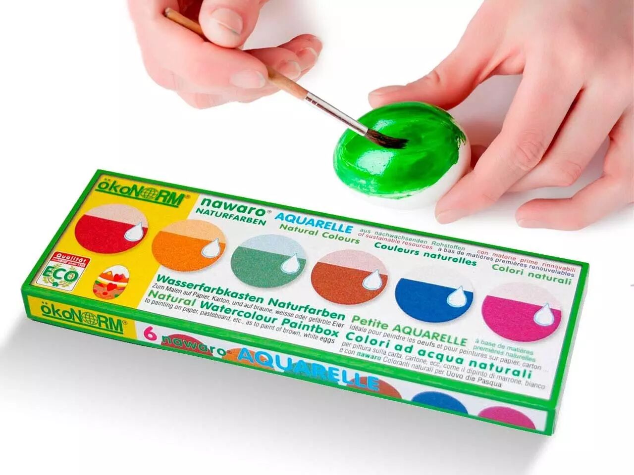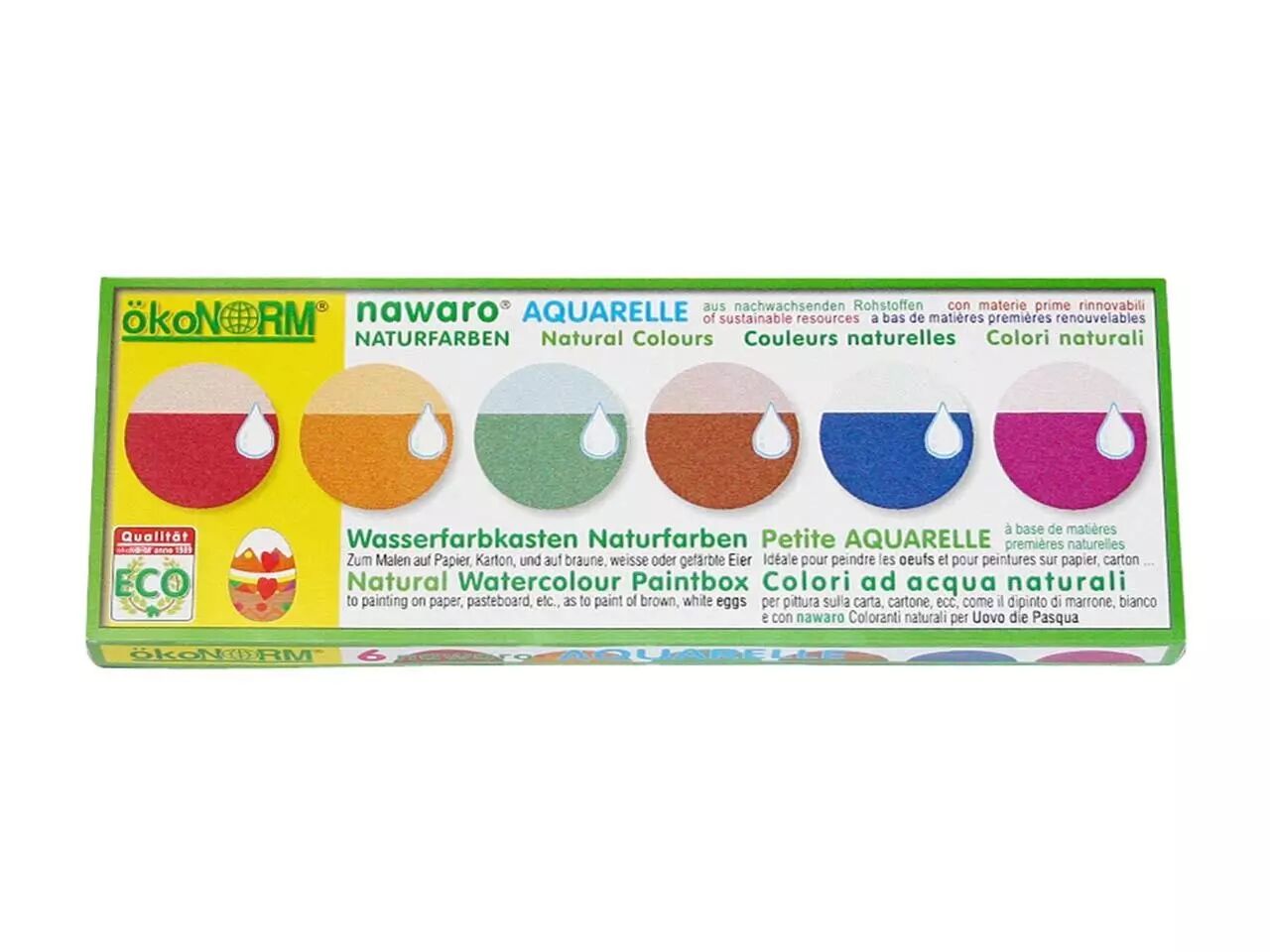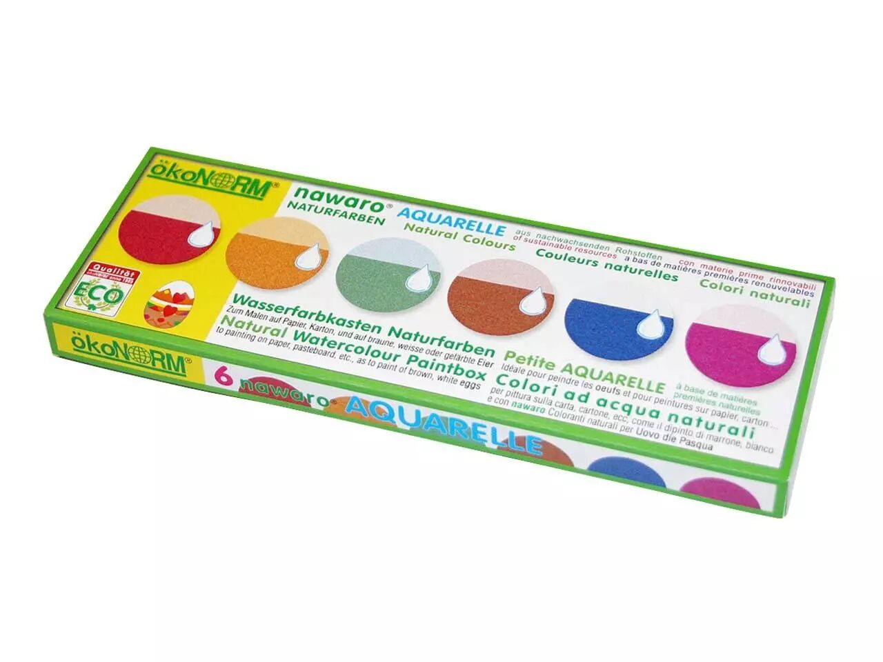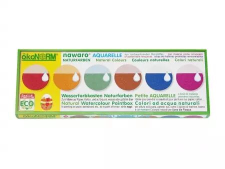 La petite boîte de peinture à l'eau nawaro convient parfaitement pour peindre sur du papier, du carton ou même sur des œufs de poule au moment de la célébration de Pâques ! Les 6 couleurs obtenues sont celles qui figurent sur l'emballage (rouge, vert, jaune, bleu, violet et noir), et sont d'origne naturelle (cochenille, curcuma, indigo, carmin, chlorophylline, charbon de bois).