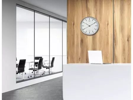 Élégante, classique et pourtant moderne, cette penduler radiopilotée est silencieuse. Finition robuste, avec cadre étroit en aluminium brossé et verre minéral. Clair et discret, le cadran permet de lire facilement l'heure de n'importe où, même dans les grandes pièces. L'horloge se synchronise avec le signal DCF77 et passe automatiquement à l'heure d'été ou d'hiver. Idéal pour les bureaux modernes, les espaces prestigieux et les amateurs de design. Ø 30 cm. Pile AA 1,5 V incluse.