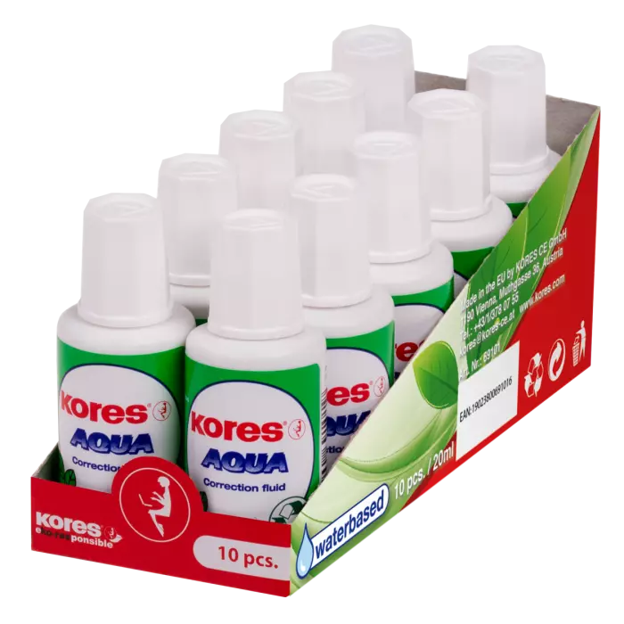 Corrigez vos erreurs avec précision et en toute sécurité grâce à notre correcteur liquide AQUA de Kores. Ce produit à base d'eau est une alternative écologique et non toxique aux correcteurs traditionnels, offrant une couverture parfaite et un séchage rapide.