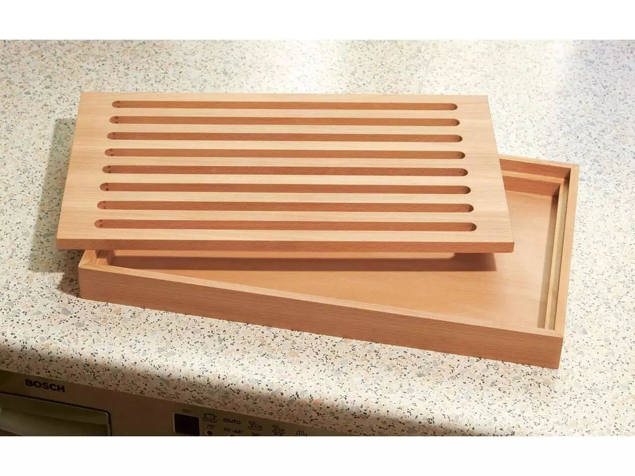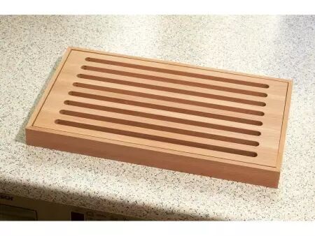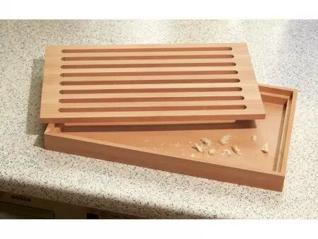Beau et pratique ! Finies les miettes partout avec cette planche à découper : les miettes passent à travers la grille en bois sur laquelle on coupe le pain. Vous videz ensuite la partie inférieure à votre convenance. En bois de hêtre massif huilé et certifié FSC®, chevillé solidement. Fabrication européenne. Dim. 23,3 x 40 x 3,5 cm.
