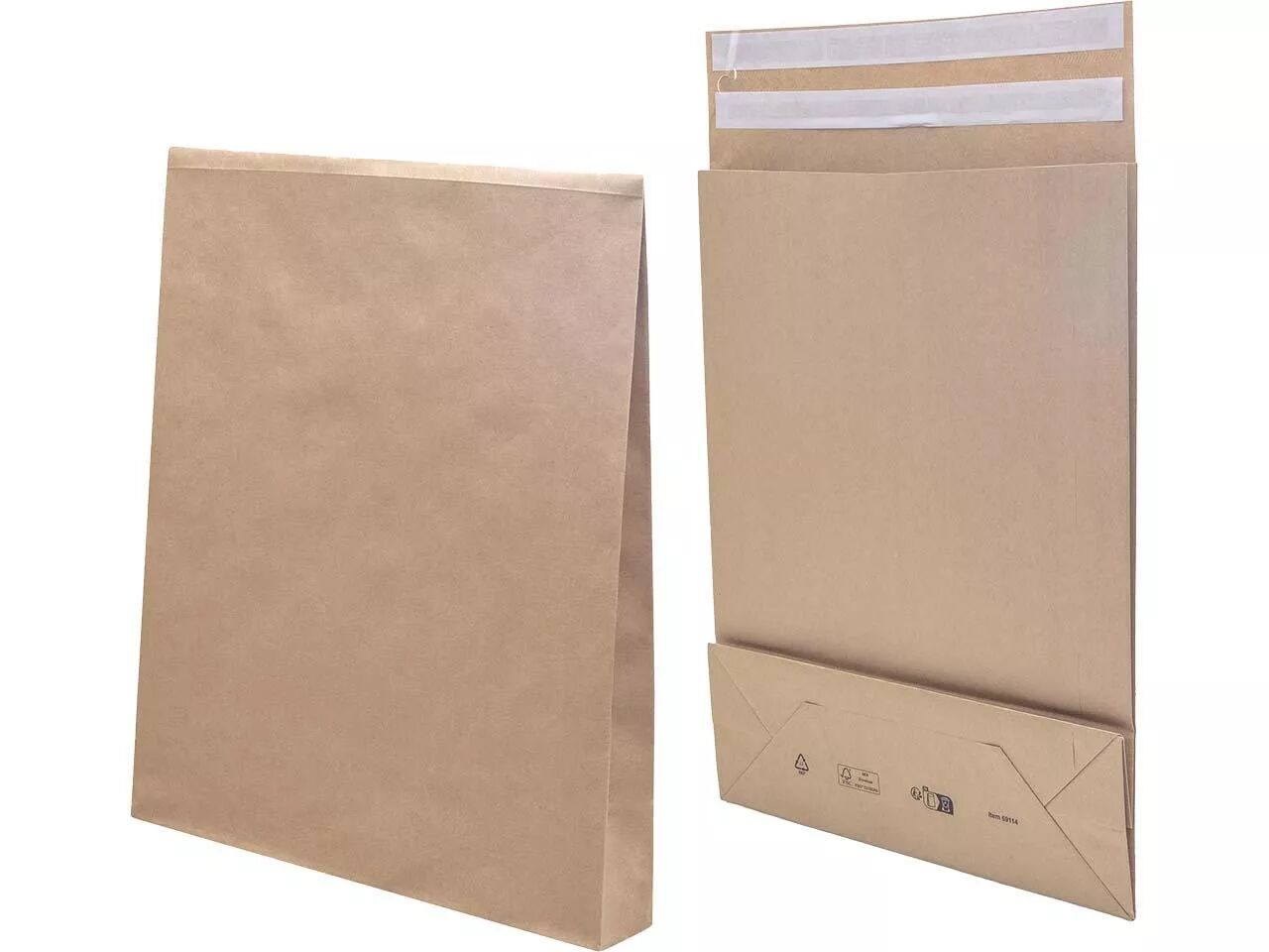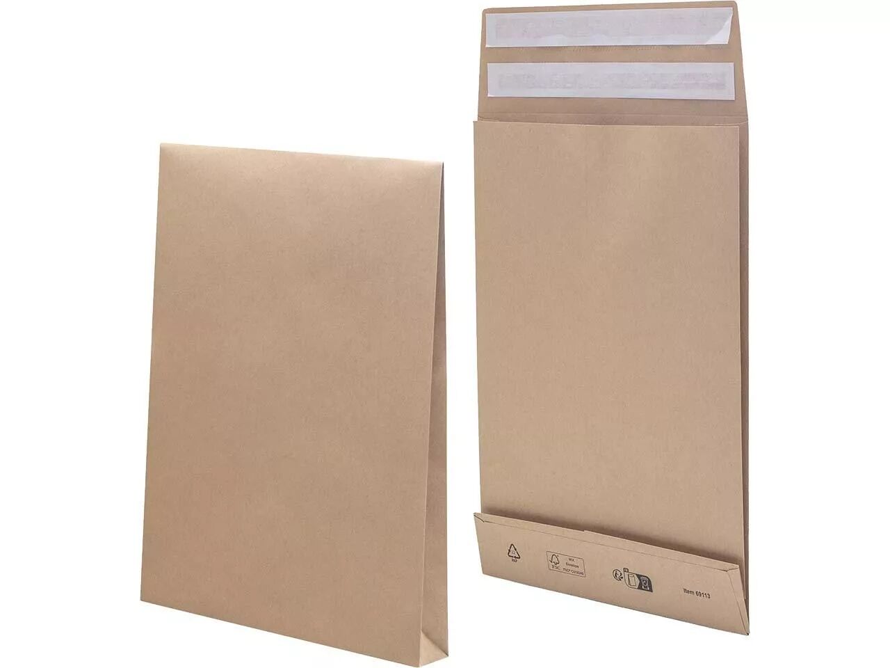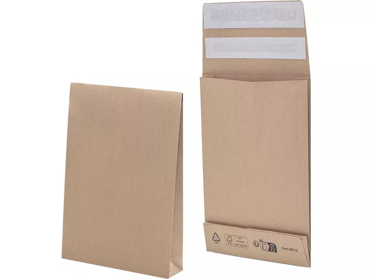 Gamme de pochettes d'expédition à soufflet en kraft brun, fabriquée en Allemagne et certifiées FSC®. Le soufflet permet l'envoi de multiples documents et la double fermeture garantit une fermeture sécurisée, pour un envoi sûr.