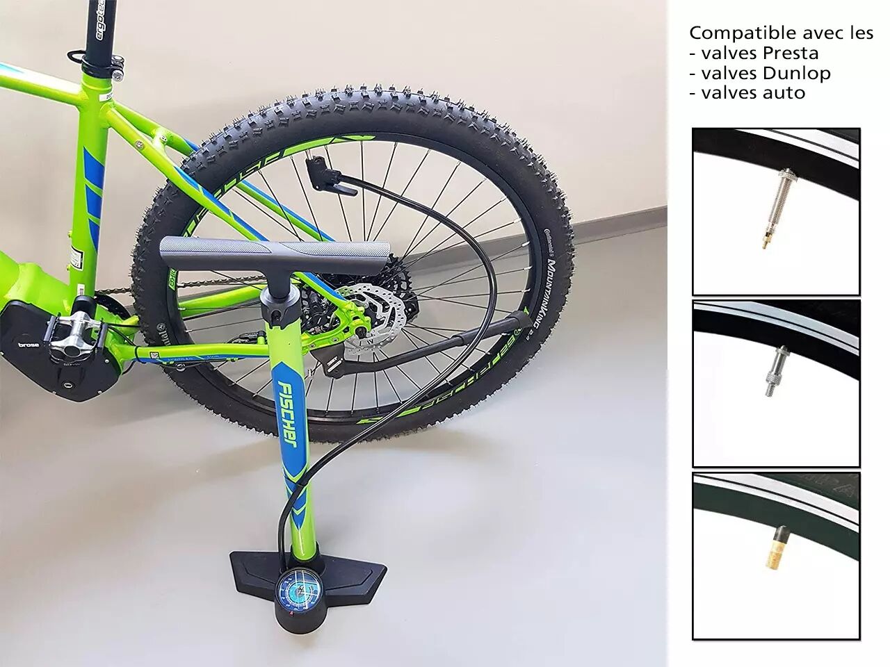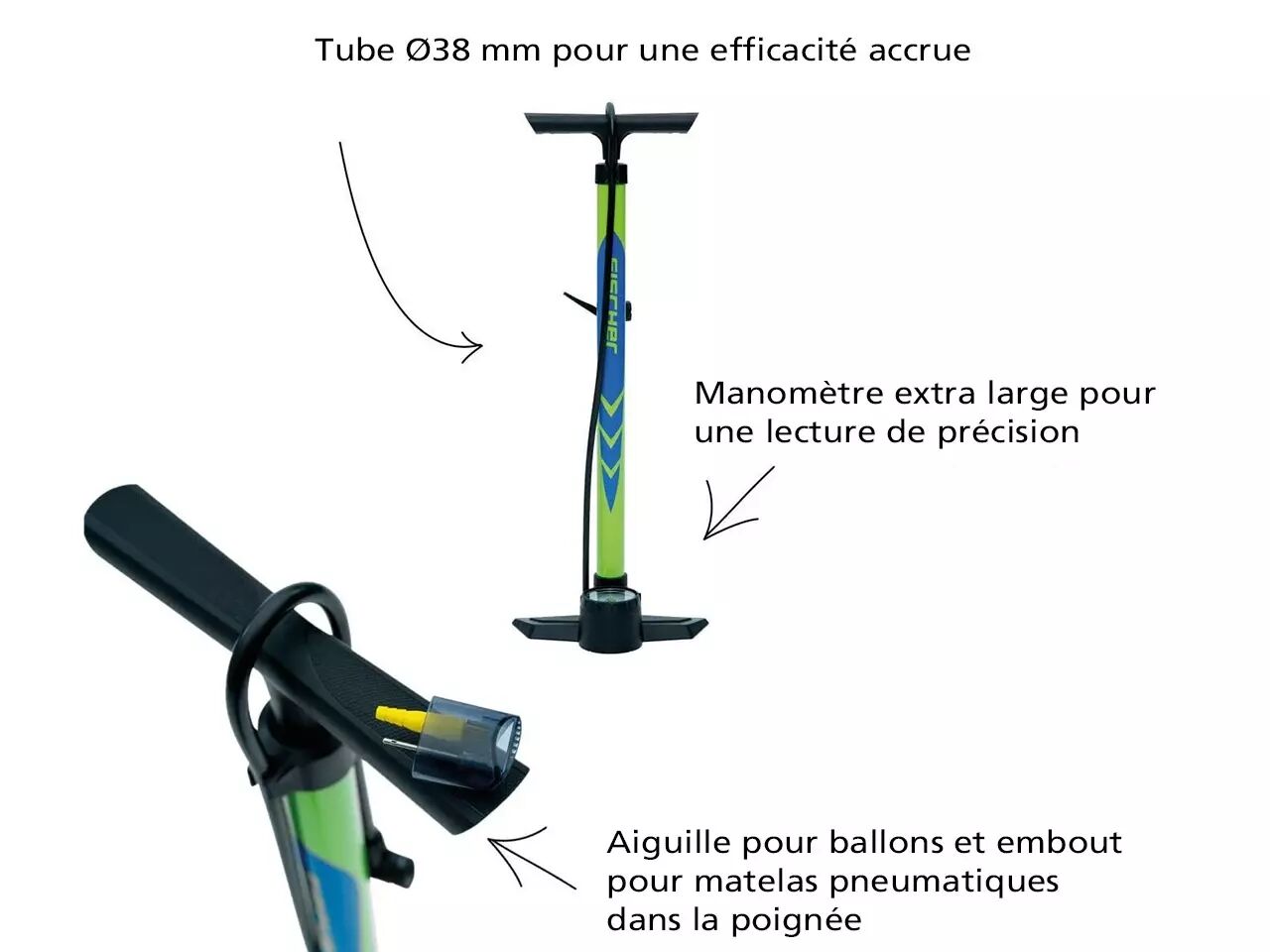• avec un grand manomètre, pour contrôler la pression de vos pneus.