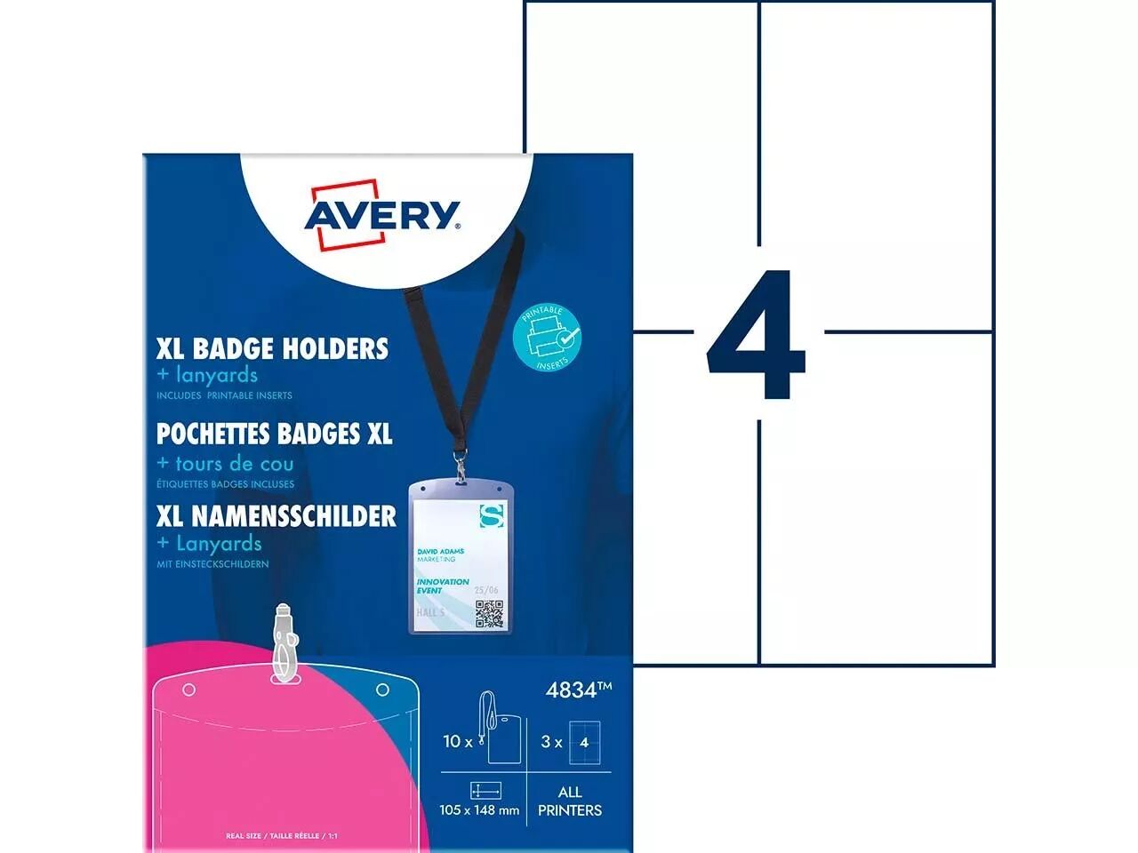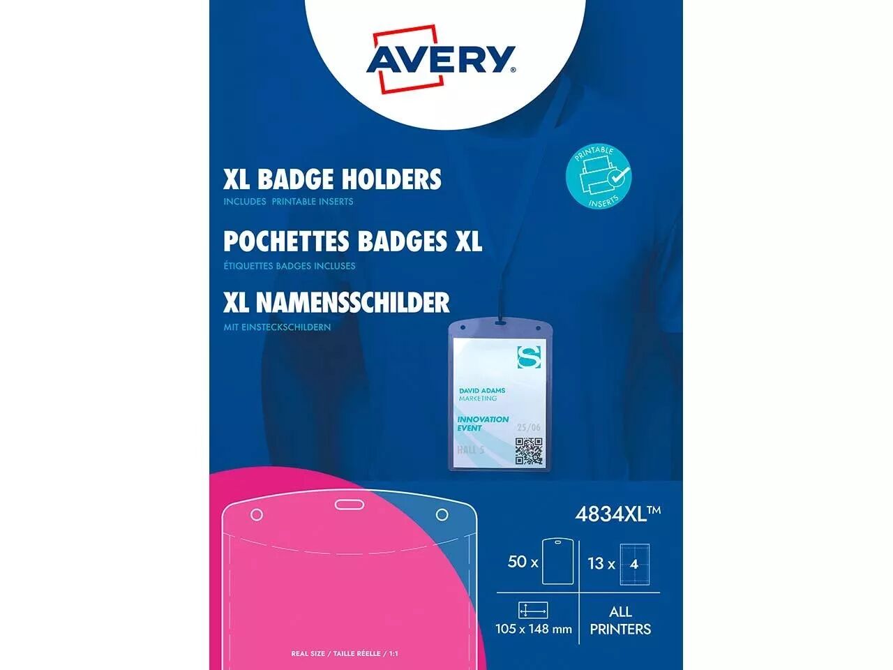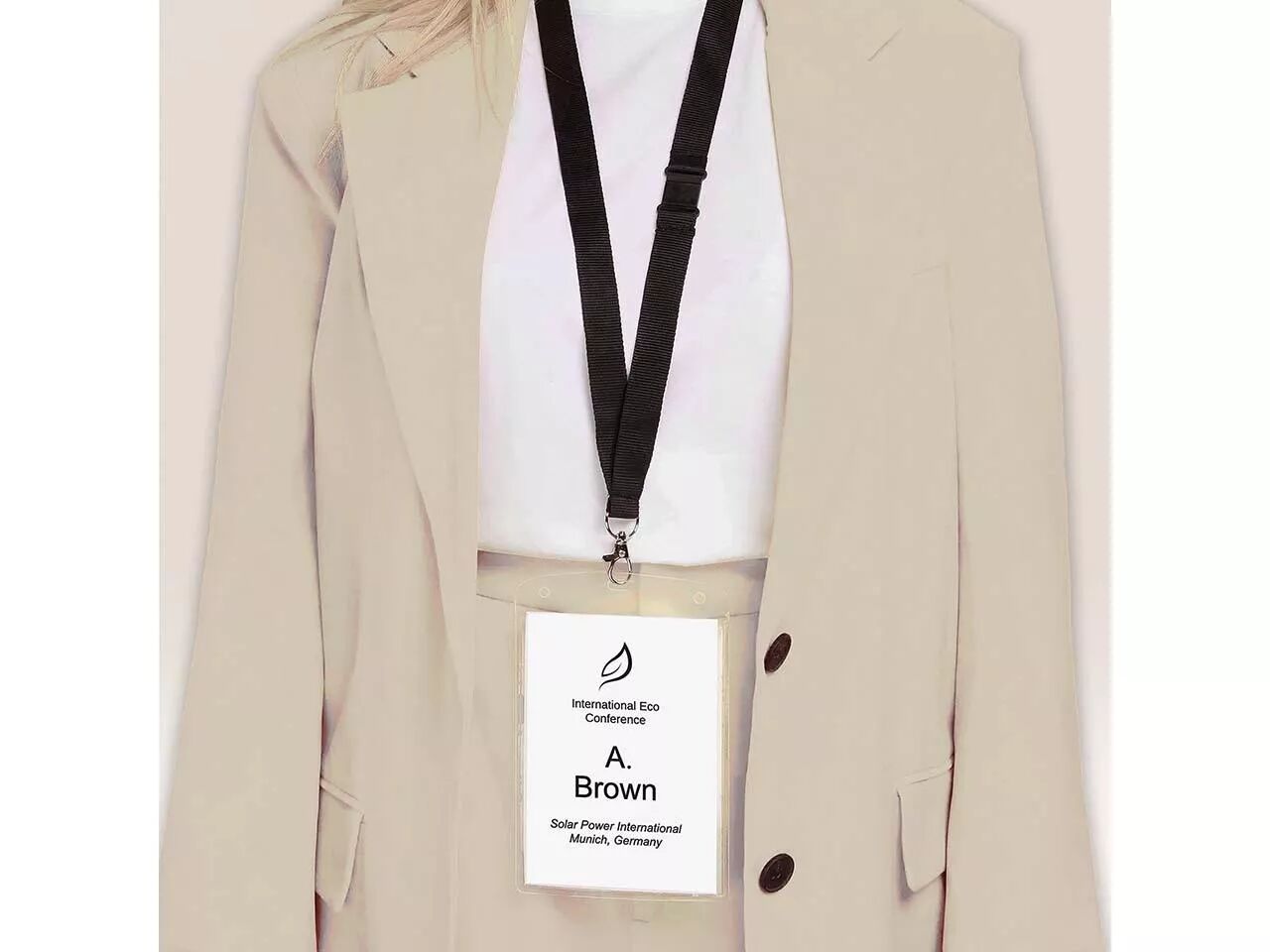 Kit de porte-badges nominatifs pour salon, composé de pochettes plastifiées et planches d'étiquettes à imprimer selon les besoins. Deux options : kit de 10 pochettes + 12 étiquettes + tours de cou ou kit de 50 pochettes + 52 étiquettes.