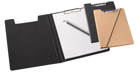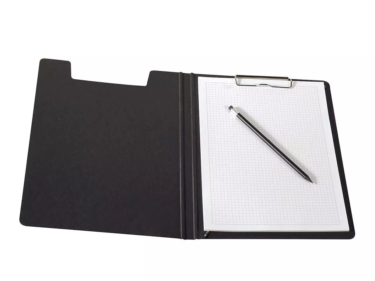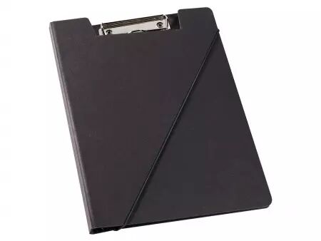 La chemise rabattable dispose d'une pince porte-bloc métallique solide ainsi que d'un élastique en diagonale. Dimensions L 23,5 x h 32 cm.
