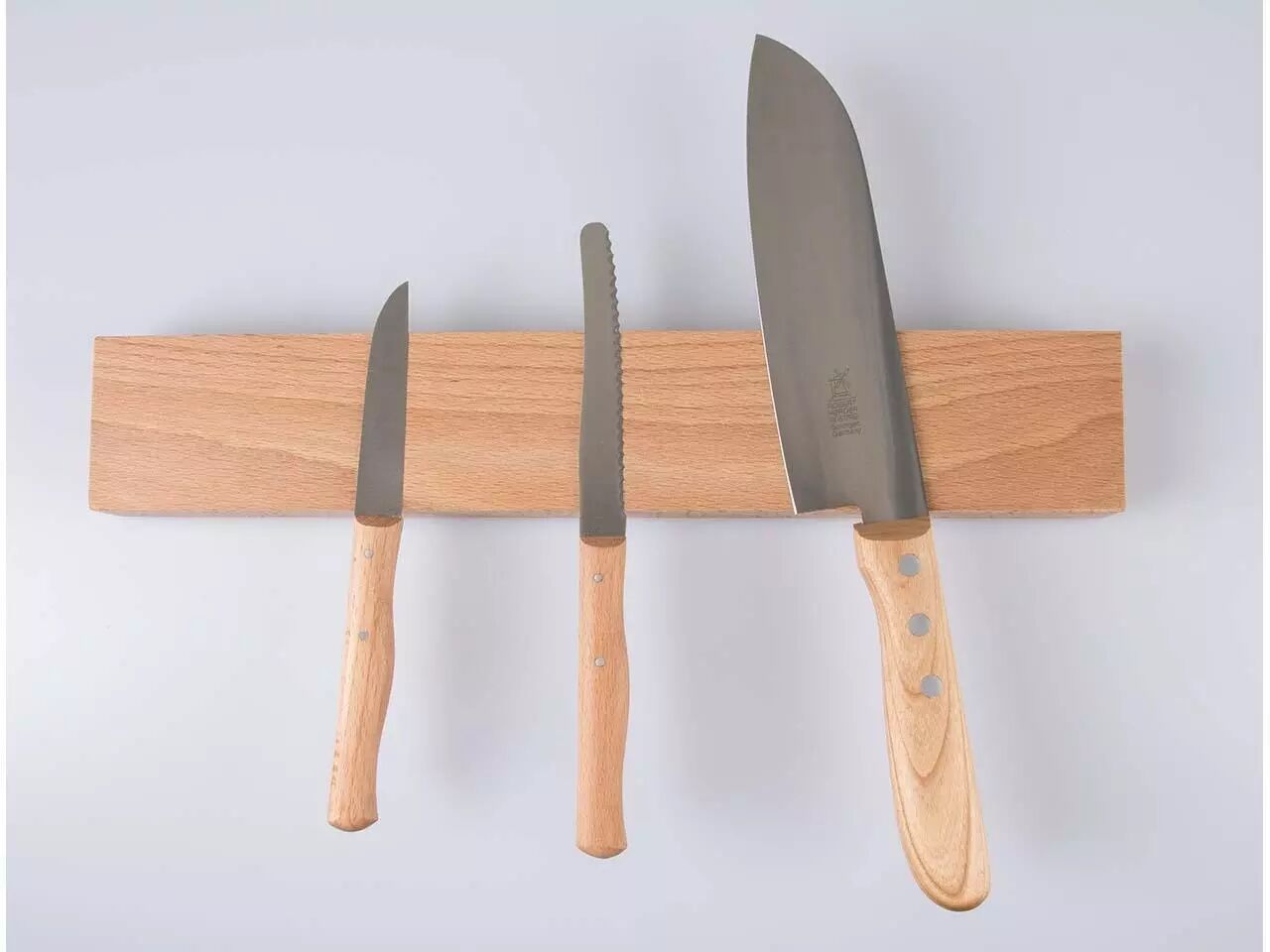 Ce porte-couteaux aimanté est en hêtre massif huilé. Prévu pour 5 couteaux, ce support mural est sobre et élégant. Son bois provient d'une sylviculture exemplaire, certifiée FSC®. Les aimants de haute qualité maintiennent les couteaux. Idéal pour avoir vos couteaux favoris toujours à portée de main, cet accessoire libérera de la place dans vos tiroirs de cuisine ! Dimensions L35 x P3 x H6 cm.