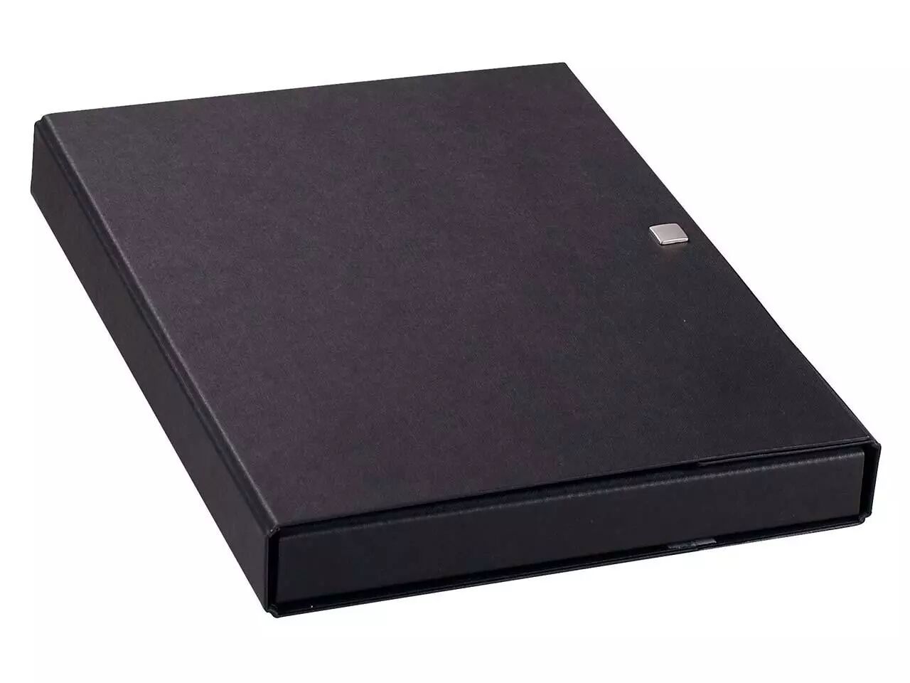 Pour divers documents A4, capacité de remplissage jusqu'à 3 cm, fermeture par bouton pression et élastique. Dimensions L 24 x h 32 cm. Surface publicitaire: sérigraphie environ 200 x 50 mm, défonce environ 100 x 40 mm.