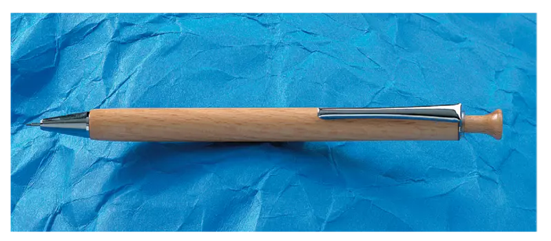 Porte-mine en bois de la gamme « Cone Line ». Fabriqué en bois de hêtre provenant de forêts sous le label écologique FSC ®. Bouton poussoir bois. Clip en acier nickelé. Livré avec 2 mines de 0,7 mm de dureté HB.