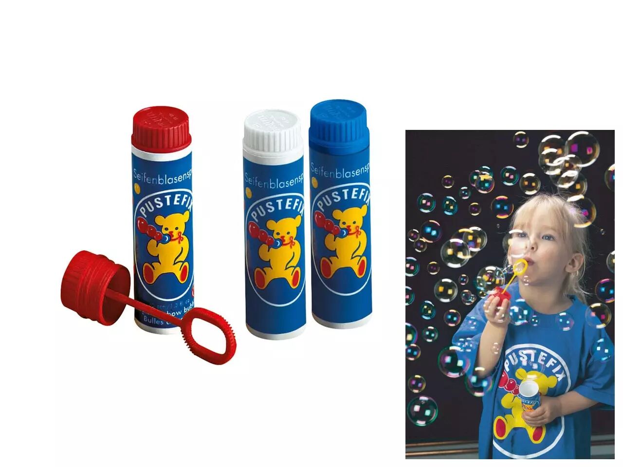 En 1948 le chimiste Rolf Hein procéda à des recherches sur des produits détergents et pour leur mise au point, fournissaient avec ses produits expérimentaux les agriculteurs d'alentours (région de Tübingen) qui lui rétrocédaient de la nourriture. Il mit au point un liquide savonneux qui convenait parfaitement pour les bulles de savon. Le professeur Hein voulut faire partager à tous les enfants cette fascination pour les bulles de savon au chatoiement multicolore, flottant légèrement dans les airs, qu'ils avaient tant de mal à créer auparavant. C'est ainsi que la marque de bulles de savon « Pustefix » avec le logo de l'ourson fut créée.