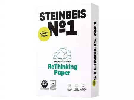 Papiers 100% recyclés  Steinbeis, coupés avec le minimum de poussière. Emballage papier recyclé spécial pour la protection de la ramette. Qualité 80 g/m², ramette de 500 feuilles.  Fabriqué en Allemagne.