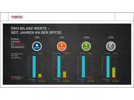 Mêmes caractéristiques écologiques que le papier recyclé Recycling Plus. Excellent écobilan et excellent rapport qualité/prix.