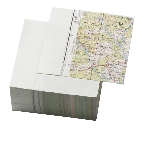 Bloc-notes 100% papier recyclé direct, 500 feuilles 9 x 9 cm. Mieux que le papier recyclé. Fabriqué à partir d'anciennes cartes d'état-major. Excellent écobilan.