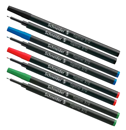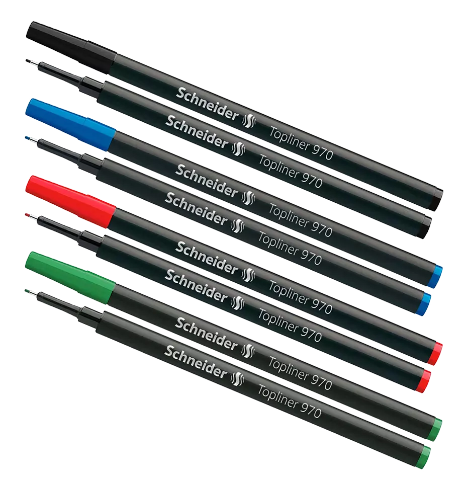 Les fineliner universels Schneider (format de recharge européen et grand format) peuvent être équipés de trois recharges différentes ! La couleur qui figure sur le corps et le capuchon permet de les distinguer facilement. La qualité «Capeless» empêche un séchage prématuré de l'encre indélébile, même lorsque le feutre reste ouvert longtemps. Garantie 24 mois.