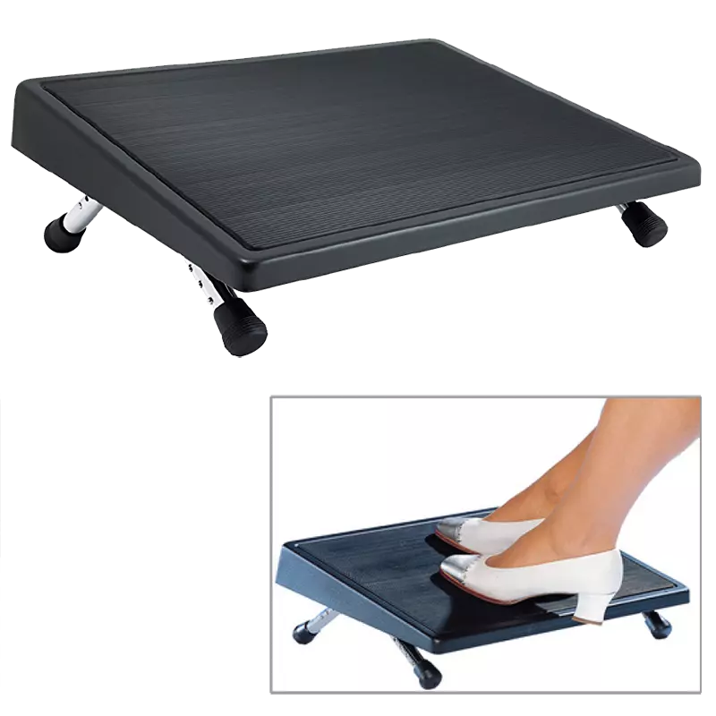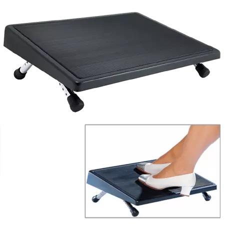 Repose-pieds conçu pour le travail sur poste informatique. Ce repose-pied est réglable en hauteur sur 4 niveaux, et en inclinaison : l'arrière se règle de 60 mm à 175 mm, et l'avant de 30 mm à 110 mm. Ce solide repose-pieds est fait de tôle d'acier, et est muni d'une plaque antidérapante avec revêtement en caoutchouc. Ses pieds sont également munis d'embouts en caoutchouc pour qu'il ne glisse pas. Dim. L450 x P350 mm.