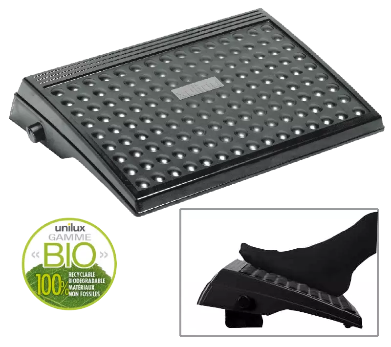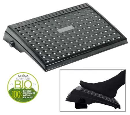 Ce repose-pied réglable est fabriqué en bio-plastique 100% biodégradable et recyclable (hormis la barre, les ressorts et les patins). Son inclinaison est réglable (10°, 15° ou 20°) ce qui lui permet de s'adapter à chaque usager. Son bio-plastique est entièrement constitué de matériaux d'origine végétale. La surface de son platon en demi-sphères exerce un massage réellement relaxant. Base anti-dérapante. L'emploi d'un repose pieds évite la fatigue musculaire des jambes, concourt au bien-être de l'employé sur son lieu de travail, ce qui contribue à l'augmentation de l'engagement professionnel Dim. L420 x P320 mm.