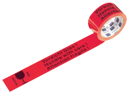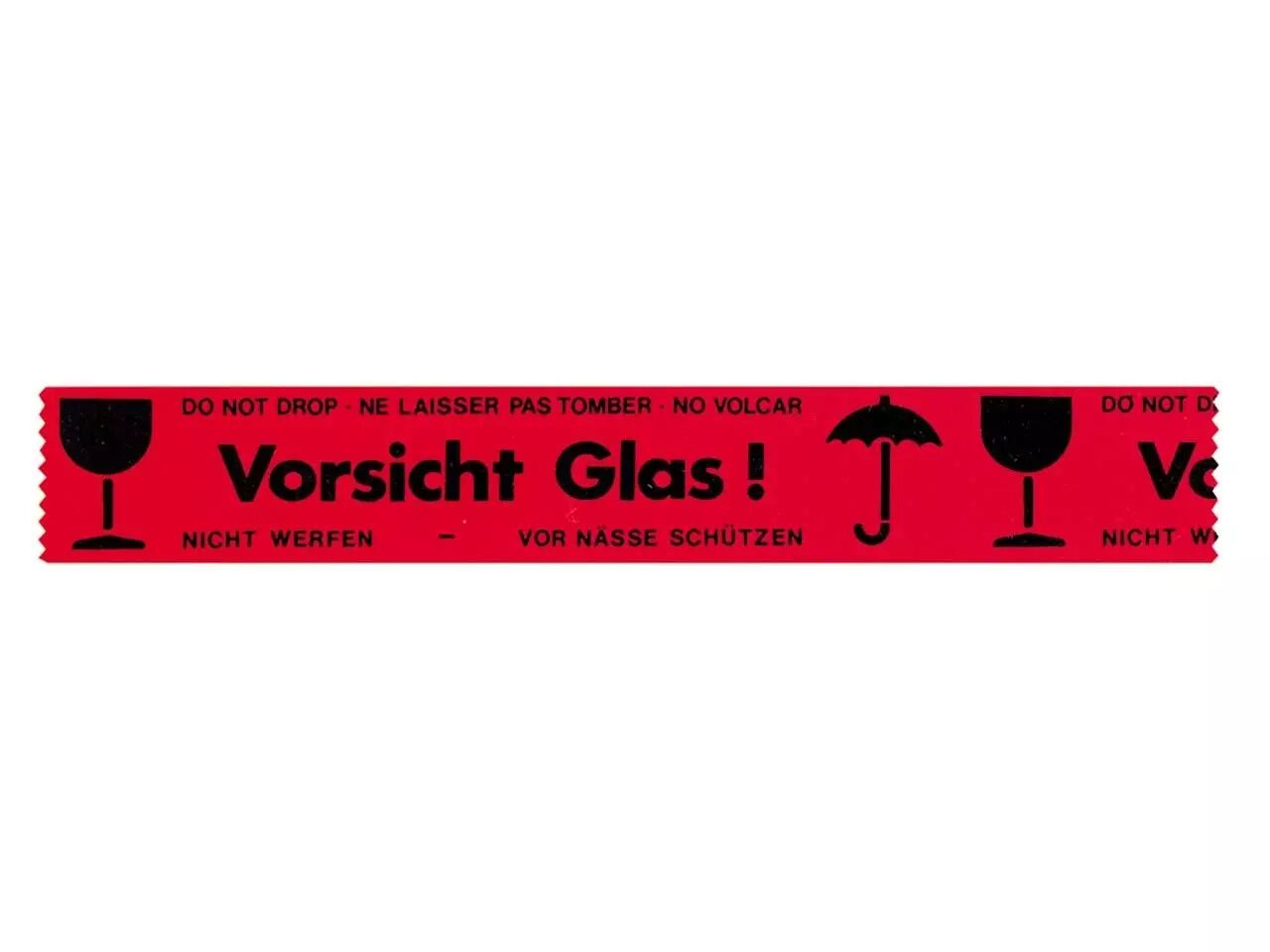Ruban adhésif avec mention "Vorsicht Glas!", et pictogramme de verre à pied. Texte en 4 langues : Allemand principalement, Français (enfin presque...), Anglais et Espagnol. En polypropylène sans chlore et colle thermofusible. Alternative aux rubans en PVC, et à un prix attractif ! Déroulement facile, adapté pour une utilisation avec dévidoir manuel et aux machines d'emballage. Rouleau de 50 mm x 50 m, rouge fluo avec impression noire.