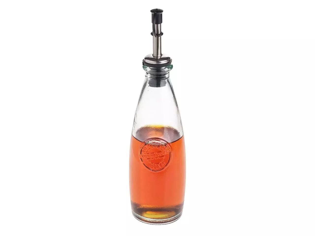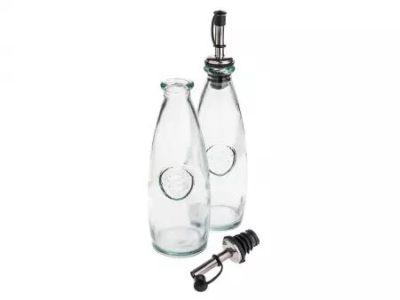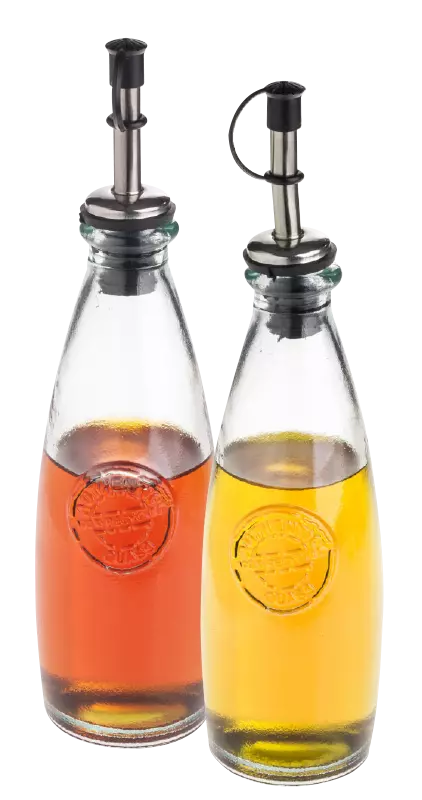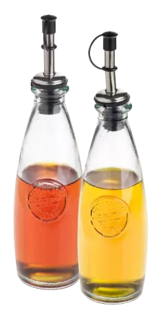 Bouchons en métal avec joint anti-fuite en caoutchouc. Becs verseurs permettant un dosage particulièrement précis. Contenance 300 ml, hauteur avec les bouchons environ 23 cm.