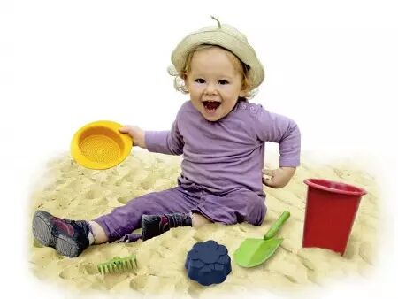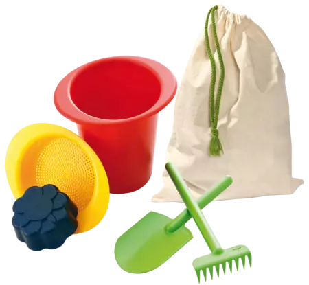 Ce set coloré issu de matières premières renouvelables (bio-plastique à base d'acétate de cellulose) constitue une alternative saine, écologique et esthétique aux jouets en plastique classiques dérivés du pétrole. Le sac en coton pratique avec son cordon de serrage contient un petit moule (x 8,5 cm), un râteau et une pelle (long. environ 20 cm) ainsi qu'un tamis (x 16,5 cm), qui s'accordent parfaitement avec le petit seau de 14 cm de haut! Toutes les pièces se distinguent par leur extraordinaire solidité, elles ne contiennent pas de plastifiants (ni PVC bien sûr) et sont conformes à la norme EN 71. Produit en Allemagne. Possibilité d'impression personnalisée sur demande .