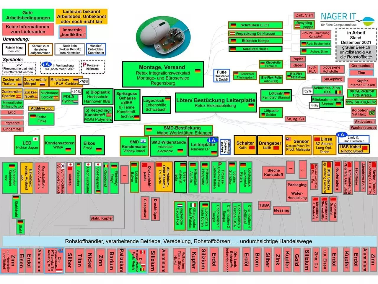 La souris optique est produite dans des ateliers allemands pour les personnes handicapées: du circuit imprimé à la fabrication du boîtier, du montage de la souris jusqu'à l'emballage. Lors de l'achat des composants, on privilégie l'Allemagne ou des pays aux normes sociales comparables. 70 % des composants proviennent d'entreprises avec de très bonnes conditions de travail. 20 % des fabricants garantissent que leurs matières premières ne proviennent pas de zones de crise (par ex. Le Congo). Le but étant d'atteindre une souris 100% «équitable».