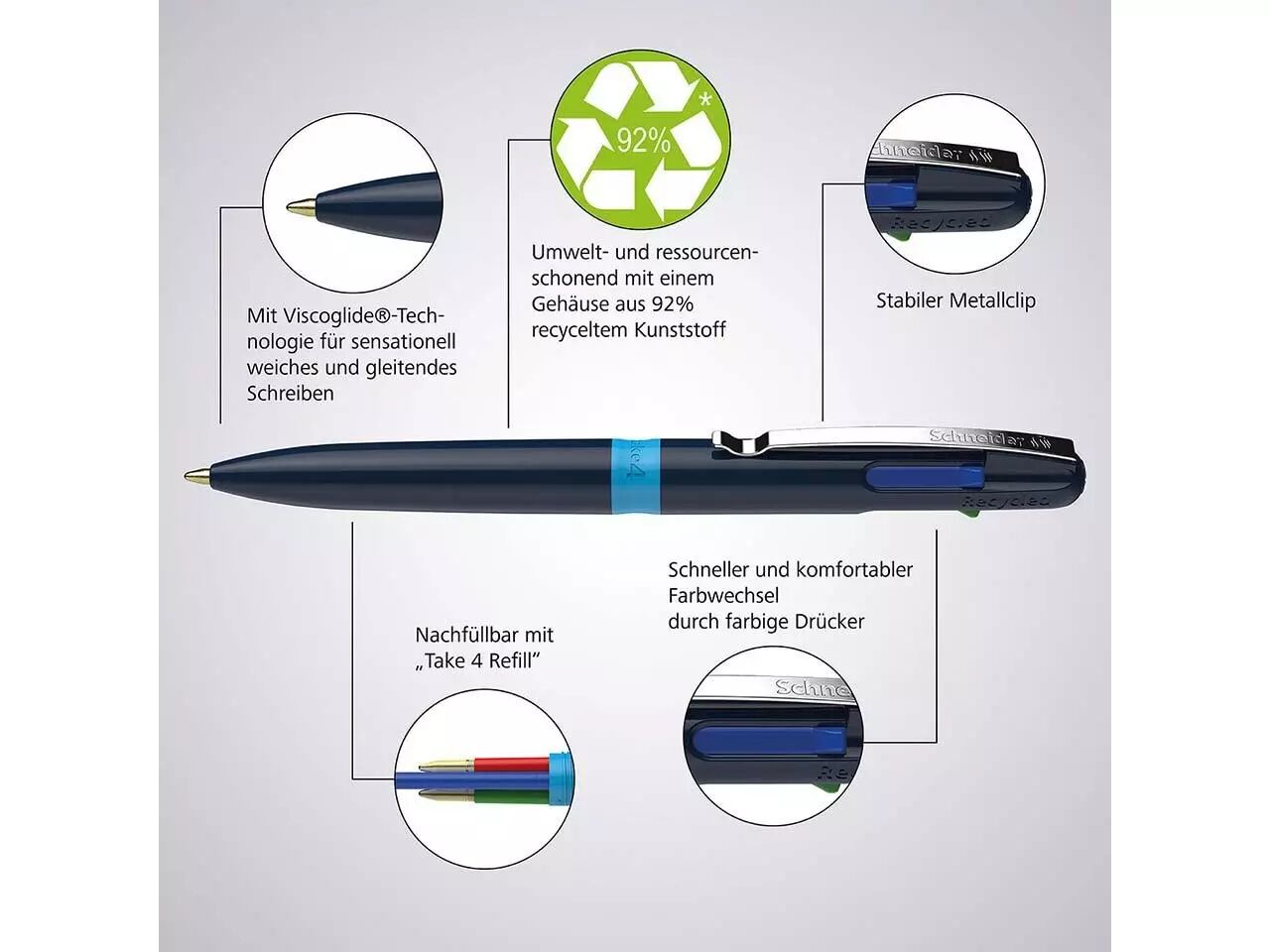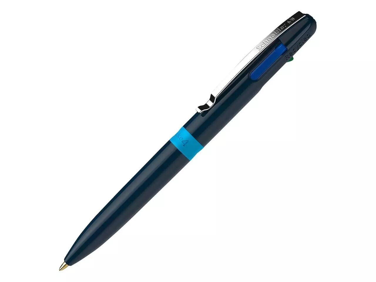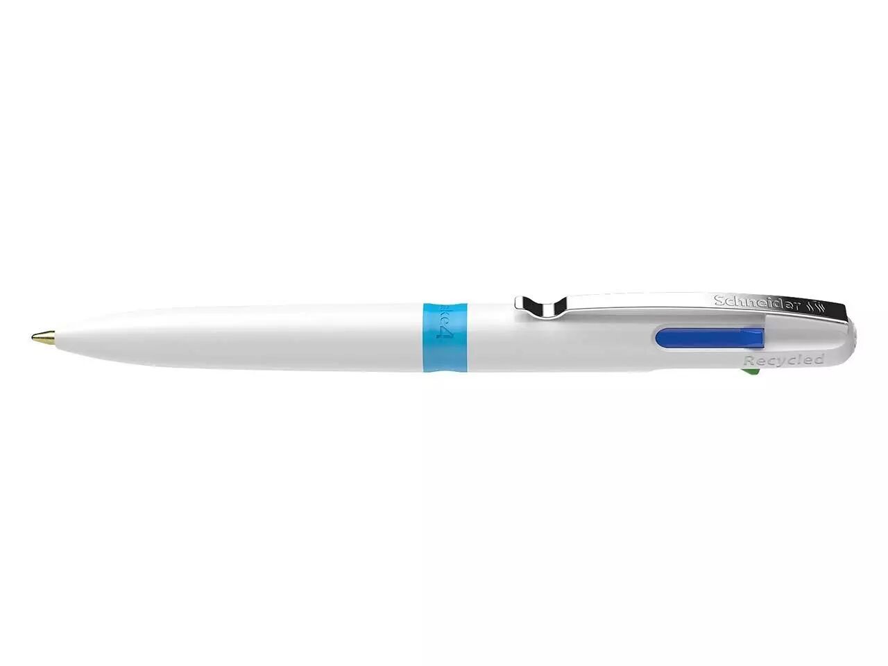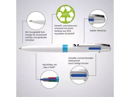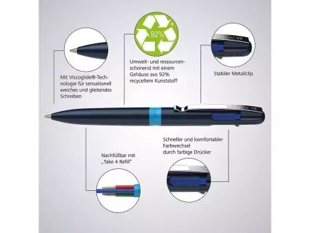 Stylo-bille 4-en-1 de haute qualité. Le stylo-bille «Take 4» de Schneider est la solution 4-en-1 parfaite, avec quatre couleurs d'encre différentes : noire, bleue, rouge et verte. Passez rapidement et confortablement d'une couleur à l'autre en utilisant les boutons-poussoirs de couleur. Son encre à la technologie Viscoglide procure une sensation de douceur et de fluidité à l'écriture. Les 4 encres sont indélébiles conformément à la norme ISO 12757-2. Avec clip métallique pratique. Le stylo-bille est rechargeable.