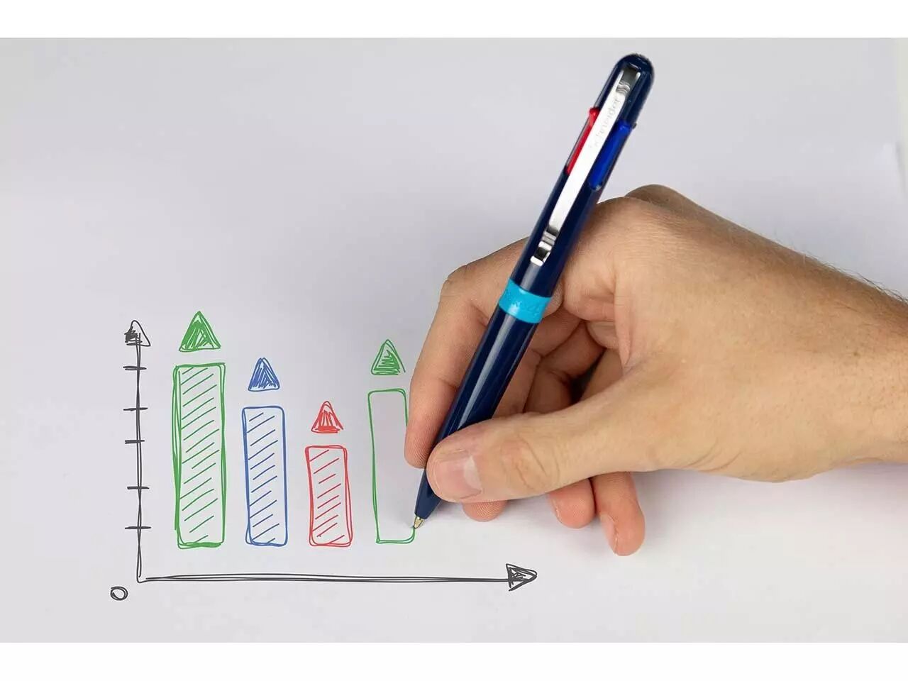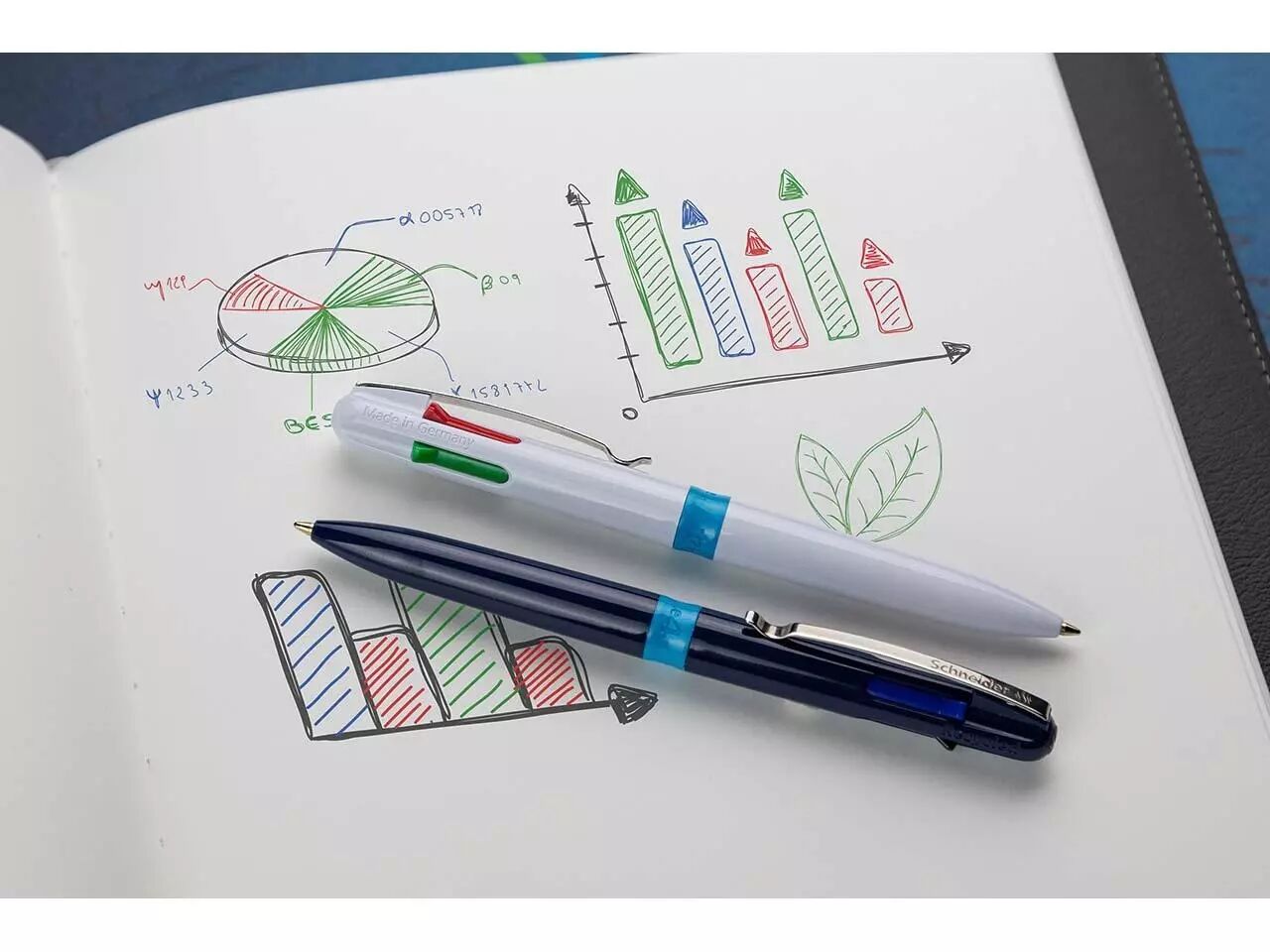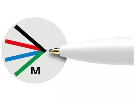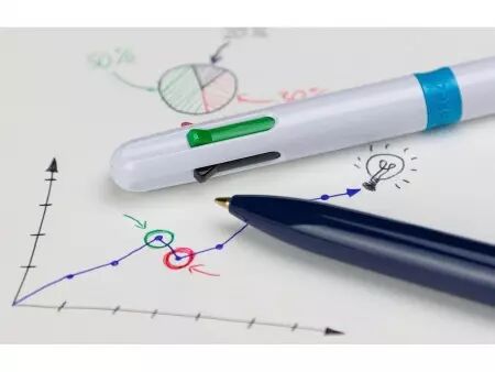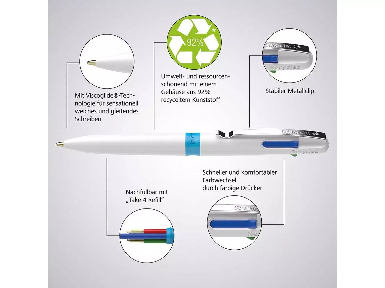 Stylo-bille 4-en-1 de haute qualité. Le stylo-bille «Take 4» de Schneider est la solution 4-en-1 parfaite, avec quatre couleurs d'encre différentes : noire, bleue, rouge et verte. Passez rapidement et confortablement d'une couleur à l'autre en utilisant les boutons-poussoirs de couleur. Son encre à la technologie Viscoglide procure une sensation de douceur et de fluidité à l'écriture. Les 4 encres sont indélébiles conformément à la norme ISO 12757-2. Avec clip métallique pratique. Le stylo-bille est rechargeable.