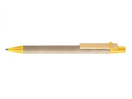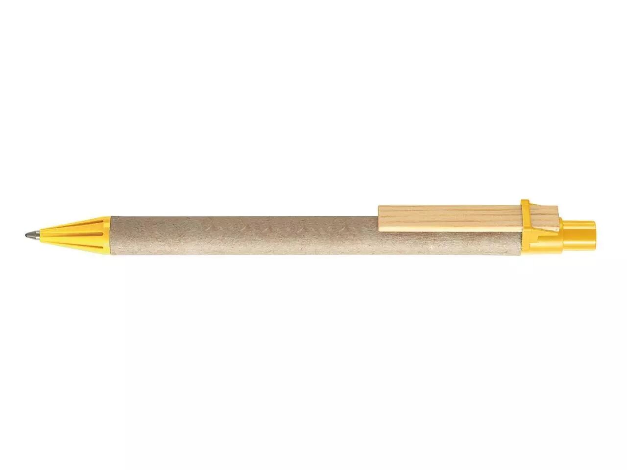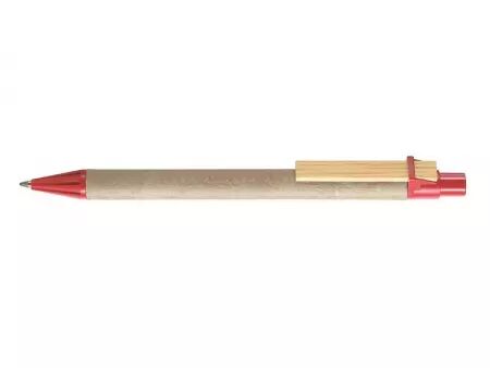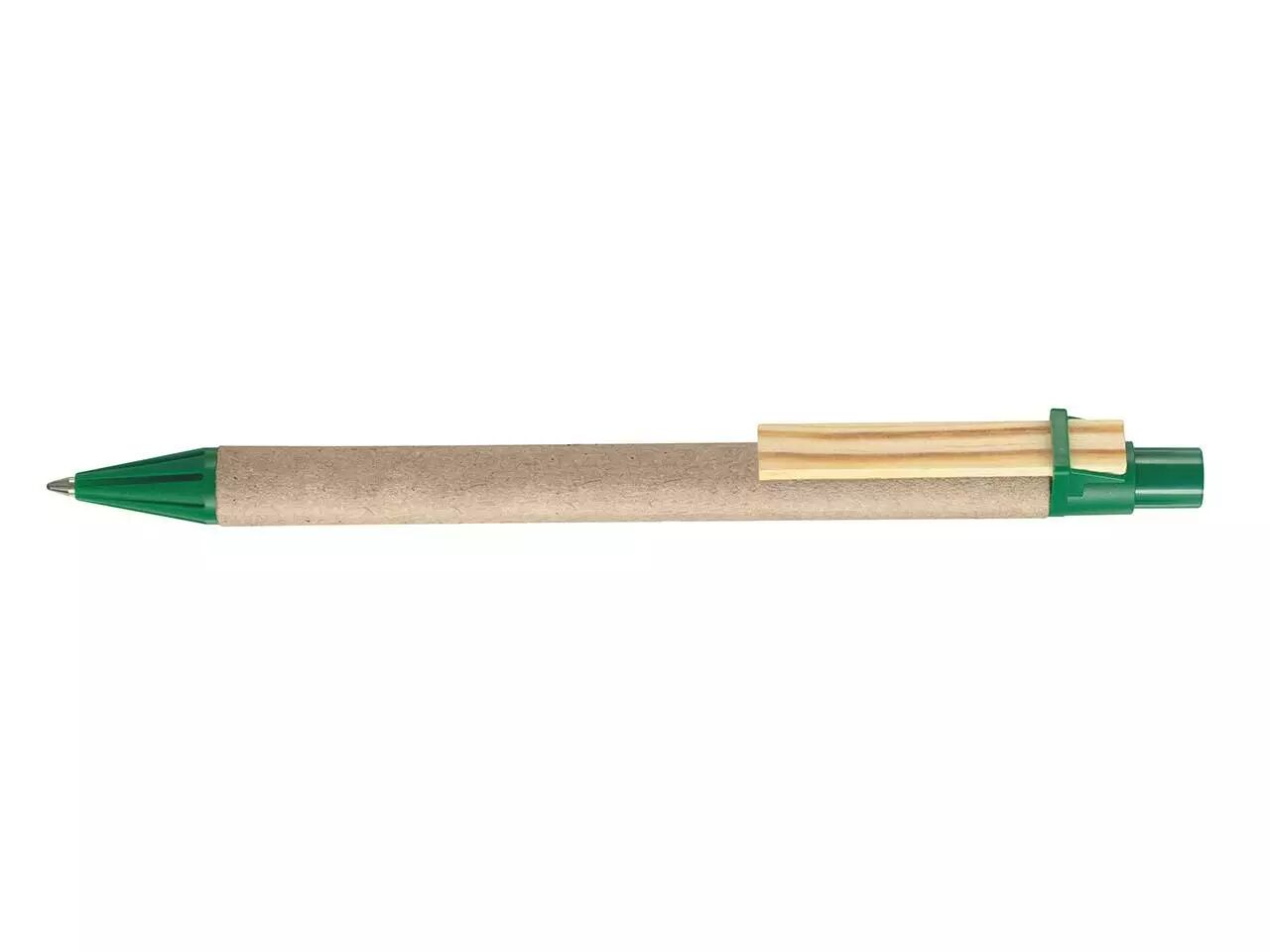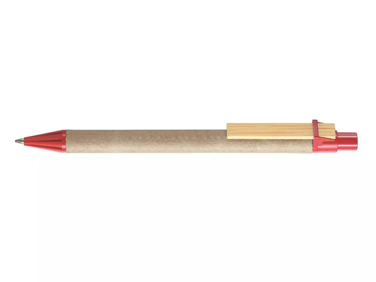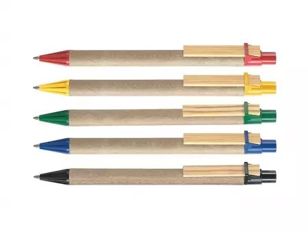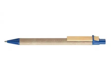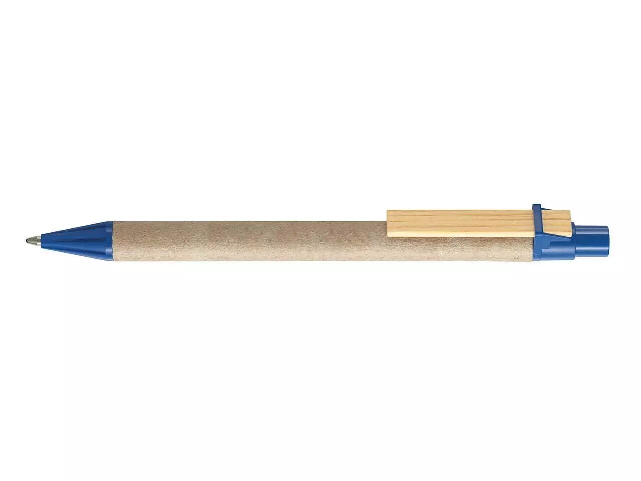 Stylo à bille clip bois plat, corps en carton et plastique recyclés, pointe rétractable. Encre bleue pour tous les stylos . Rechargeable par recharges type X-20.