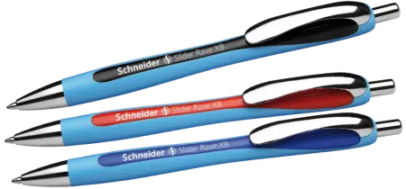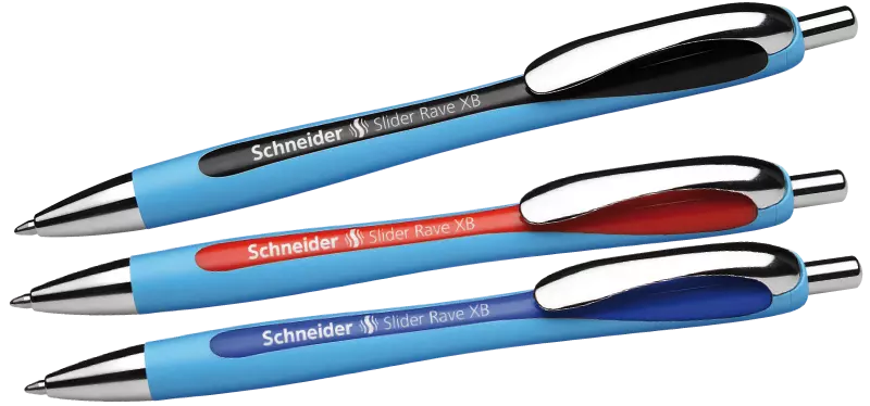 La pointe extra large et étudiée du «Slider Rave» vous promet le plaisir de l'écriture qui glisse avec une douceur incroyable, ainsi que de longs moments d'écriture sans bavure. Le gainage caoutchouté permet de surcroît une écriture sûre et relâchée sans fatigue de la main. L'encre sèche rapidement - même sur du papier lisse - et ne s'efface pas, même avec un surlignage. Les couleurs noire et bleue sont inaltérables conformément à la norme ISO 12757-2. Grâce au système astucieux «plug and play», les corps des stylos «Slider Rave» (en plastique sans PVC) peuvent être équipés au besoin de recharges aux pointes de différents formats.