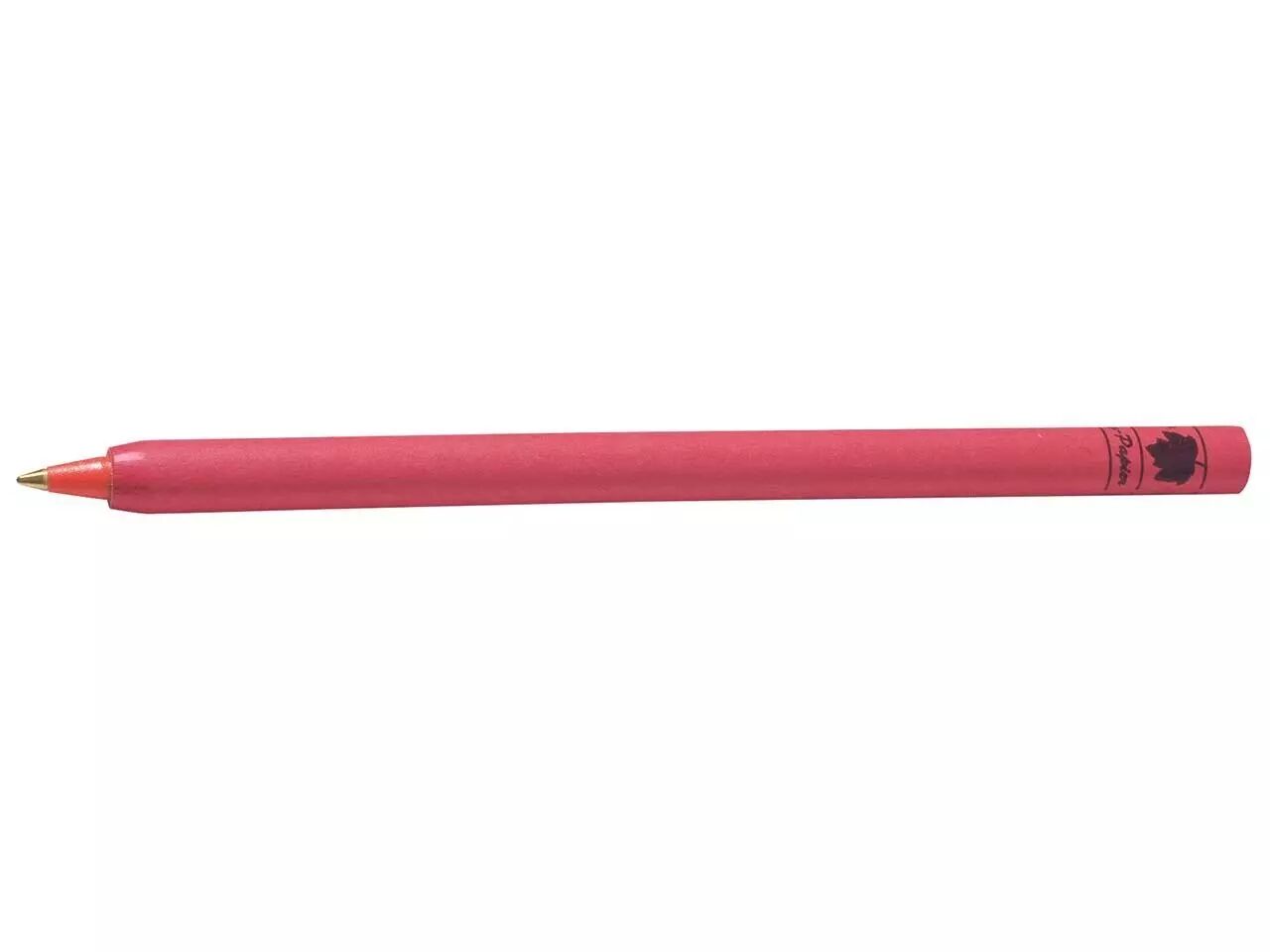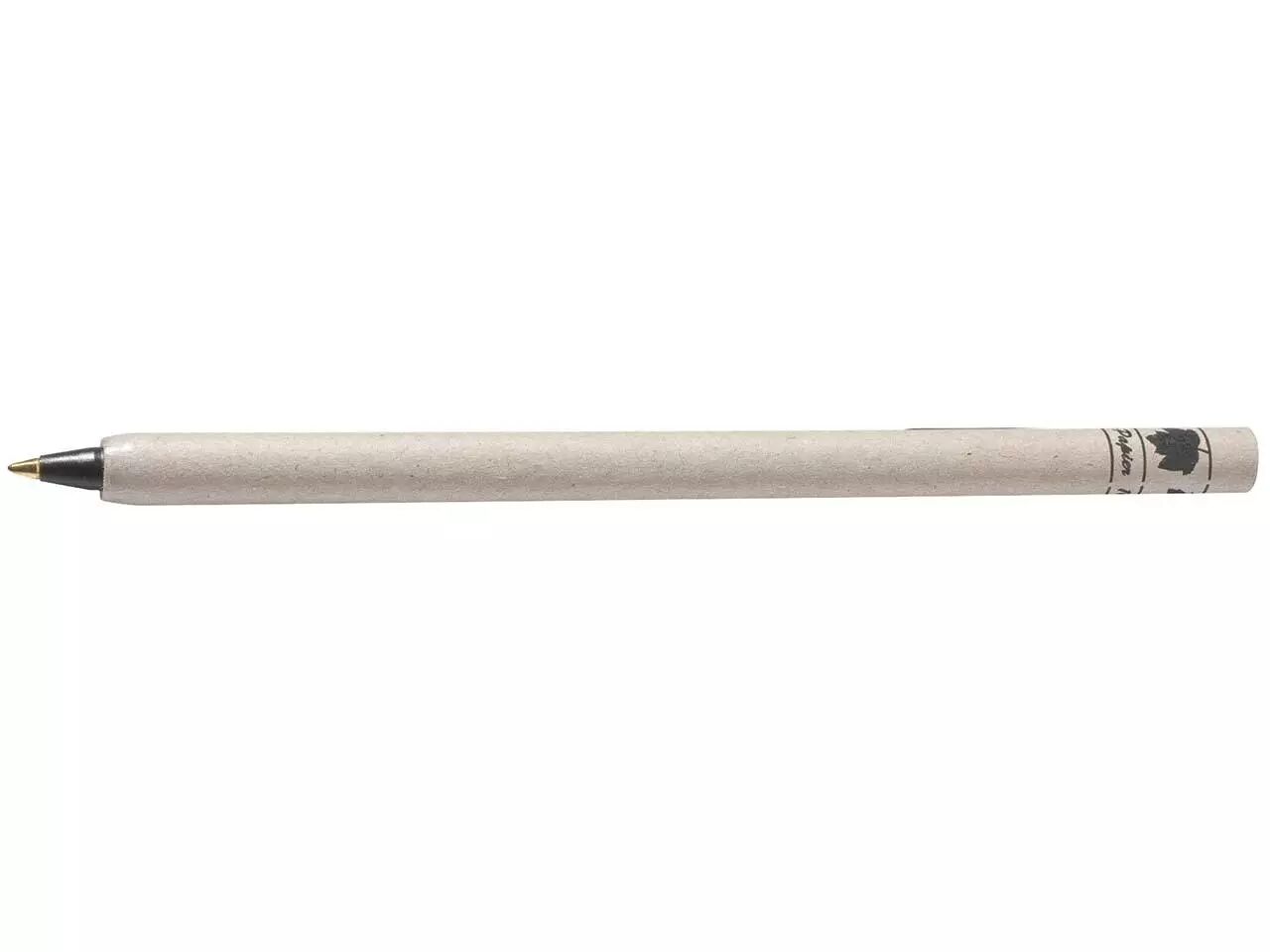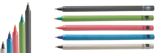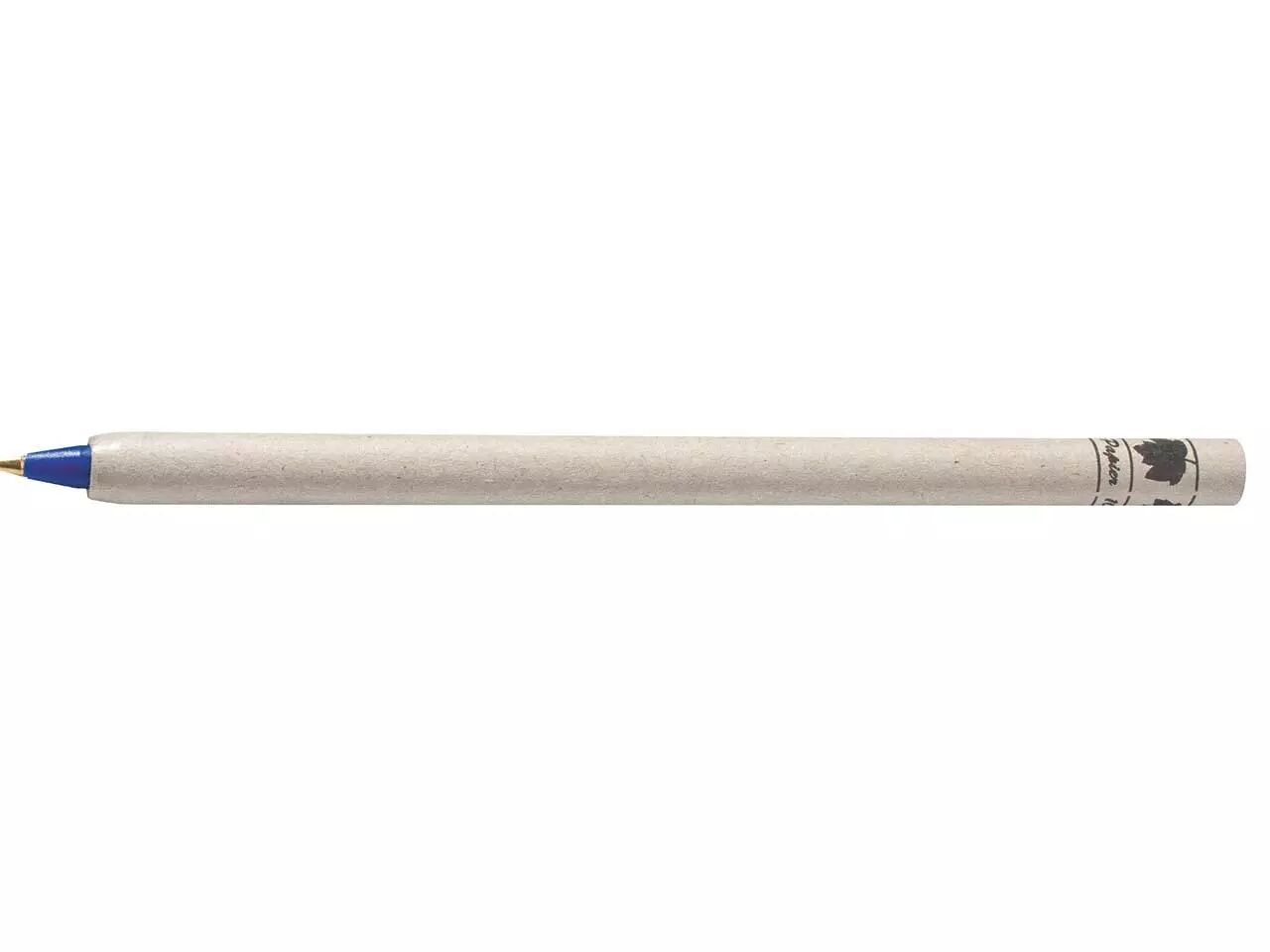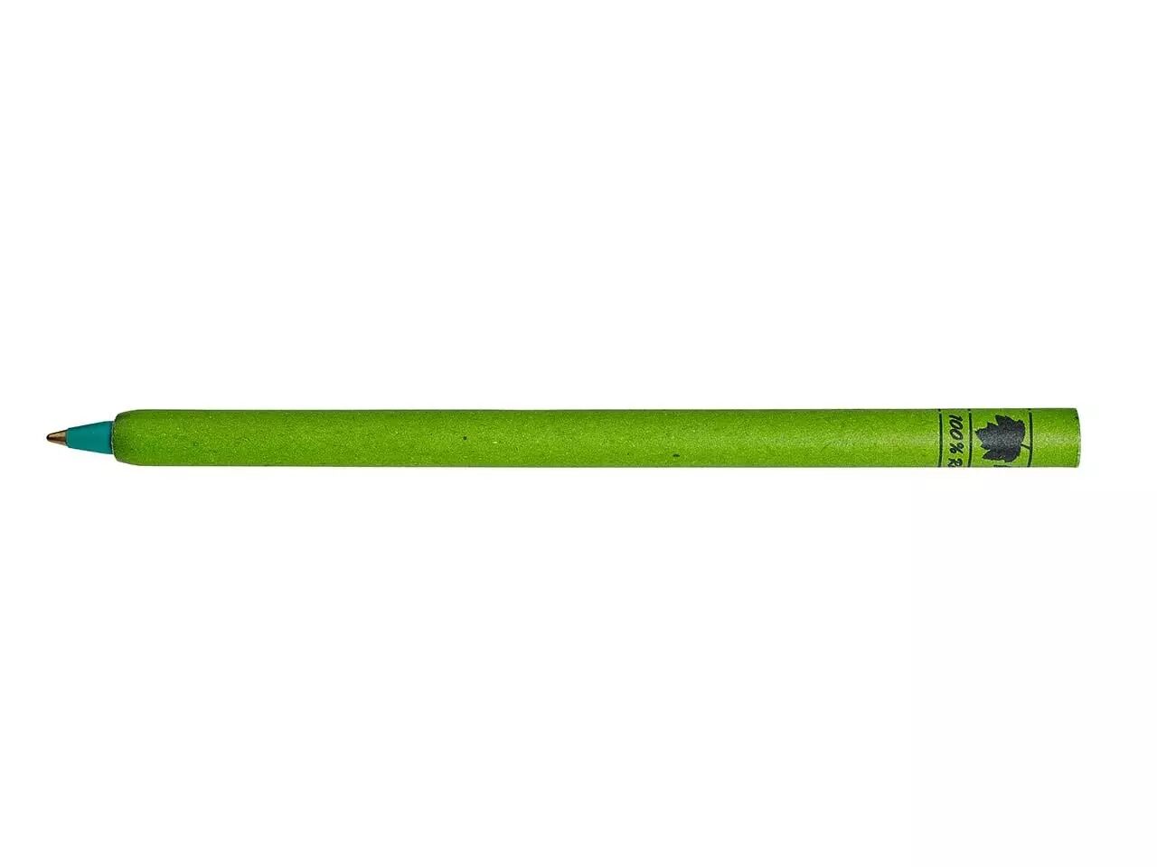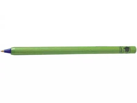 Stylo à bille avec corps en carton recyclé, collé avec de la colle à la caséine (protéine du lait), rechargeable.