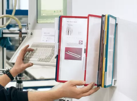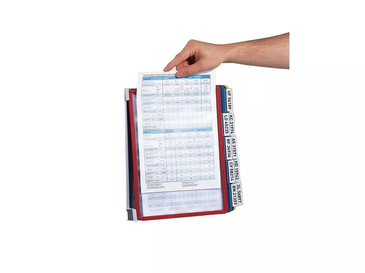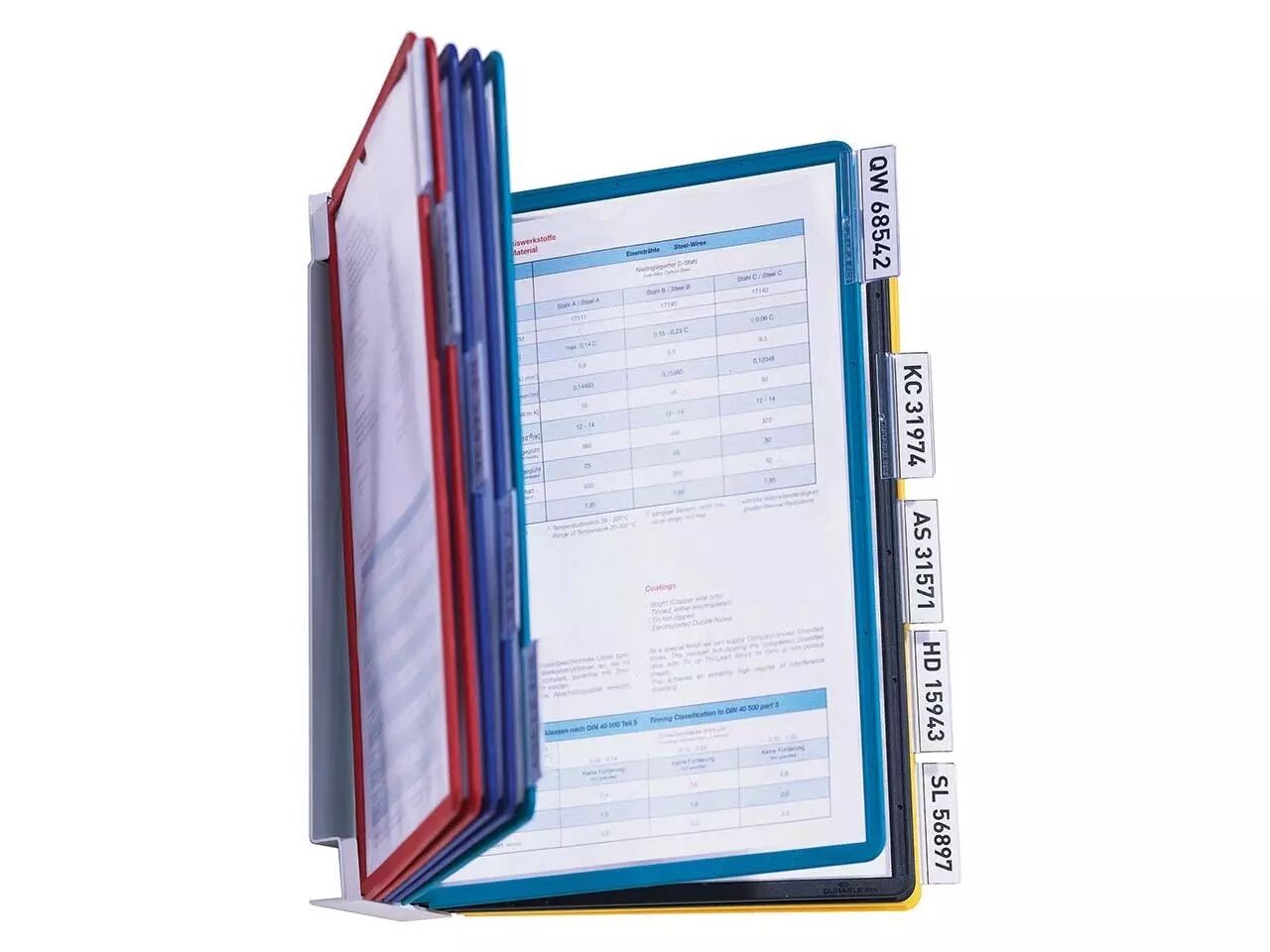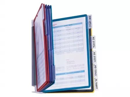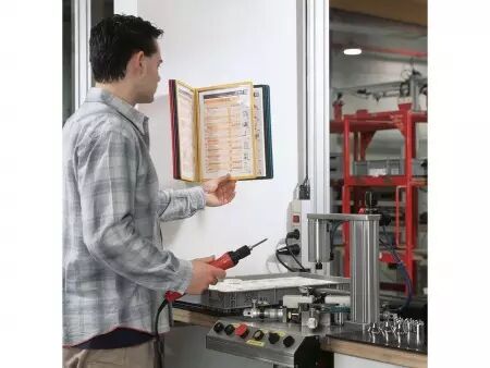 Le système comprend : un support métallique mural, 10 pochettes assorties 5 couleurs : noir, rouge, jaune, vert et bleu (2 pochettes par coloris), 10 onglets d'indexation. Plusieurs systèmes peuvent être installés côte à côte sans problème !