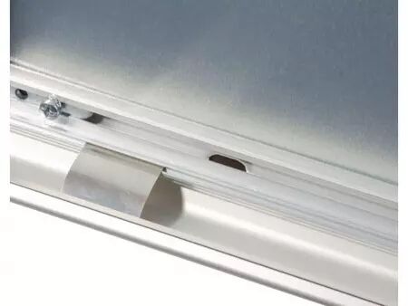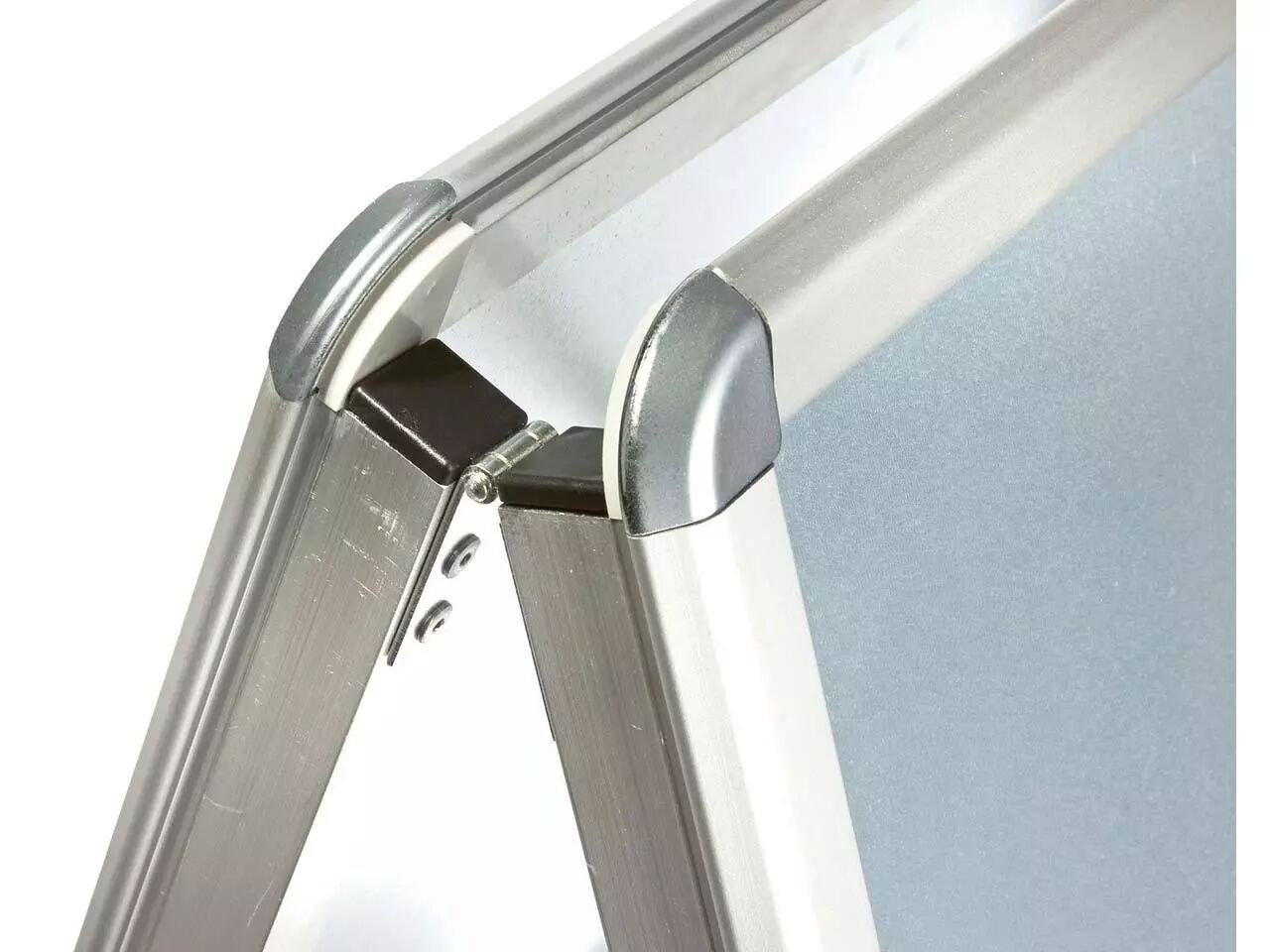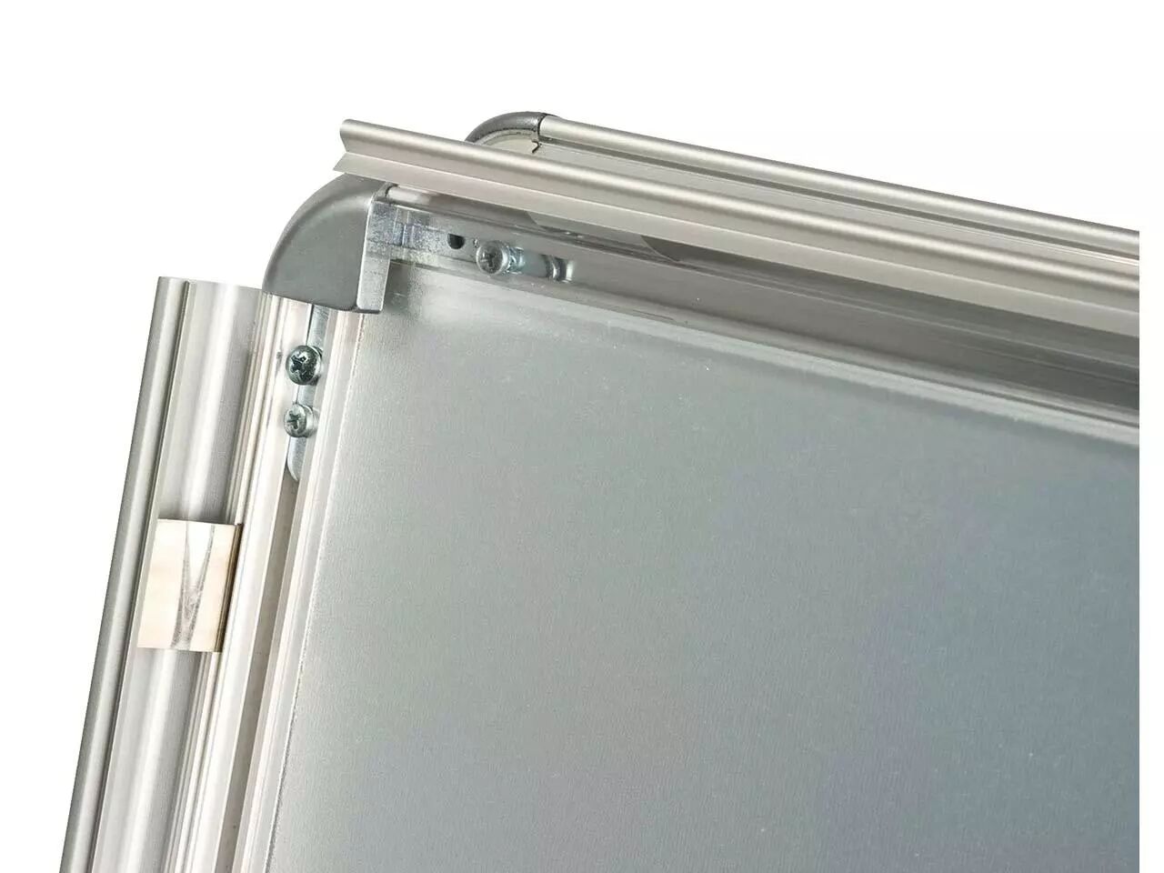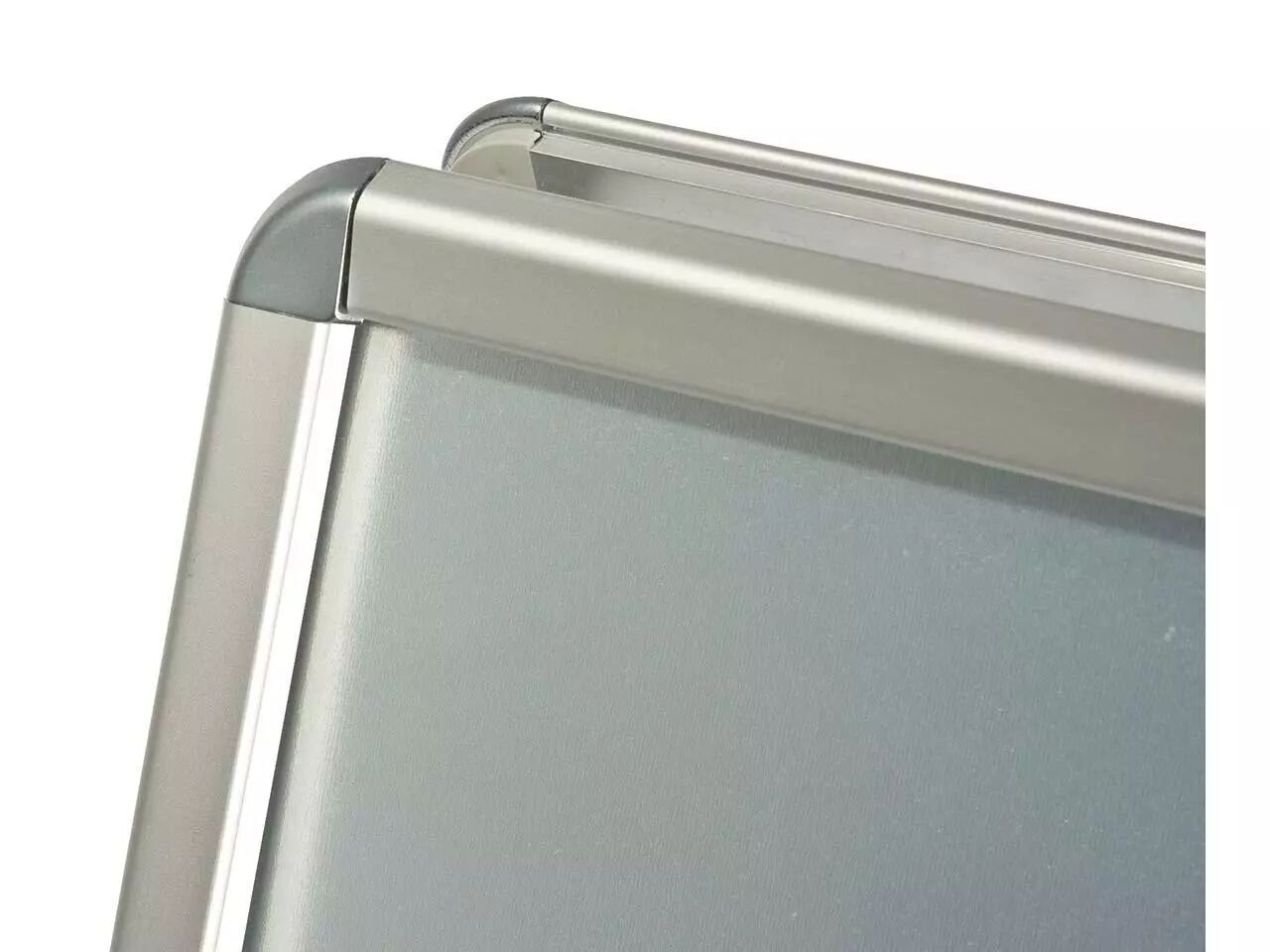 Changement facile des affiches grâce au système d'ouverture des cadres. Structure en alu anodisé couleur argent (32 mm), dos en tôle d'acier zingué, coins en plastique ABS, livraison avec 2 feuilles de protection en polypropylène. Dim. 64 x 10/82 x 108 cm.