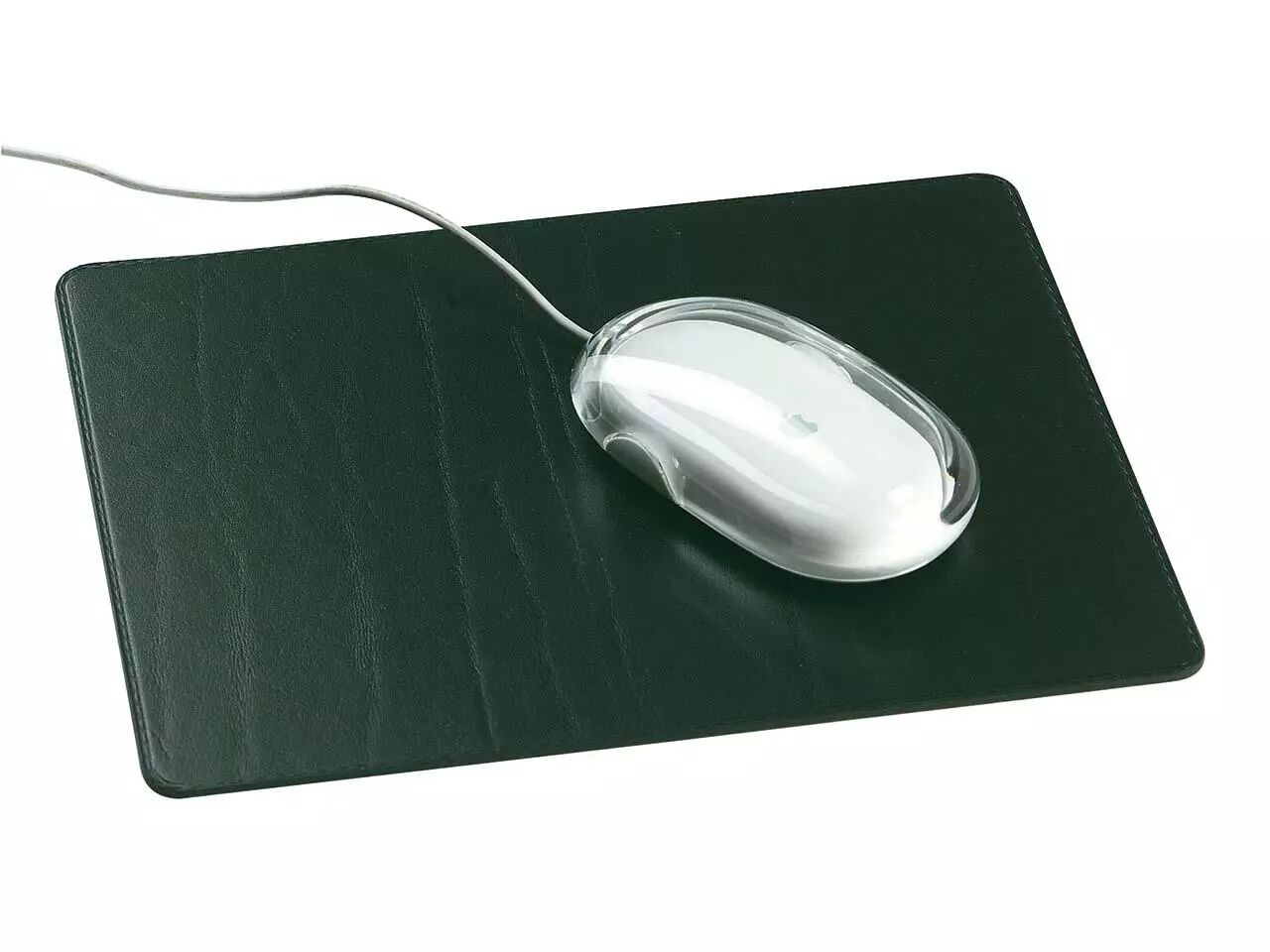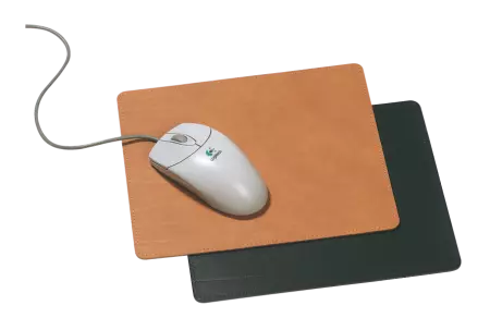 Tapis de souris en cuir recyclé, fabriqués à partir de déchets de cuir moulus et mélangés à du latex. Se distingue à peine du cuir véritable. Alternative au PVC. Bords arrondis, avec coutûre périphérique. Épaisseur : 2,5 mm. Dim. : 19,5 x 24 cm.