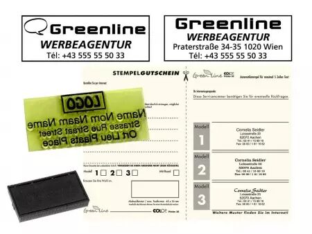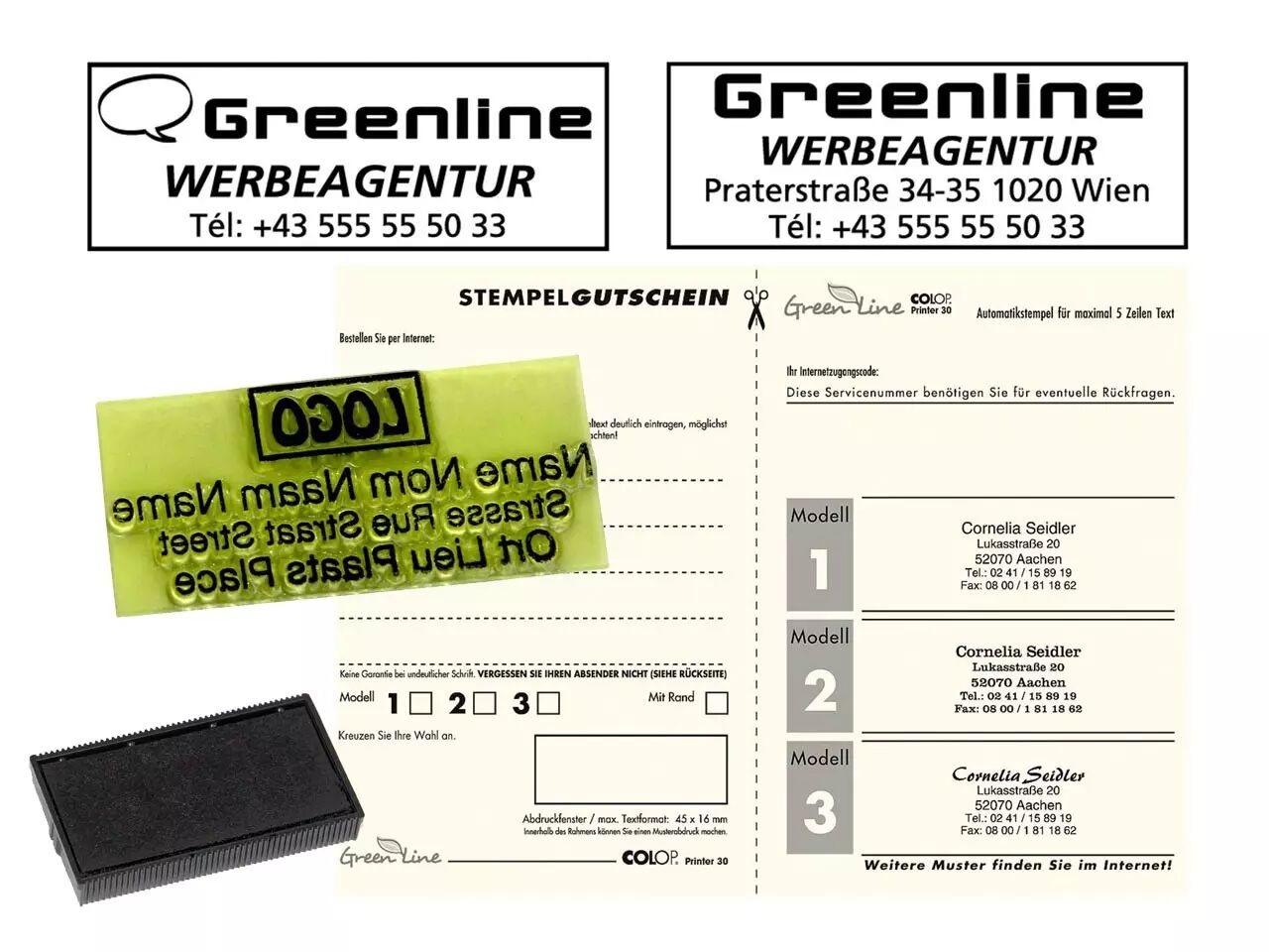 Le timbre automatique est livré accompagné d'un bon de fabrication prépayée de votre plaque de texte personnalisée (avec ou sans logo). Grâce au site Internet du fabricant, vous composez en ligne par vous même votre tampon, avec un large choix de polices de caractères, attributs (souligné, cadre) et choix de mise en page. Une fois validé en ligne vous recevez par la Poste votre timbre caoutchouc en moins de deux semaines !