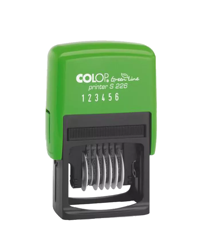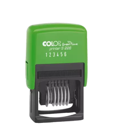 Timbre automatique numéroteur à 6 chiffres Printer S226 de la gamme « Green Line » de chez COLOP. Le réglage des chiffres se fait par molettes. Encrage automatique grâce au tampon encreur noir fourni (ré-encrable).