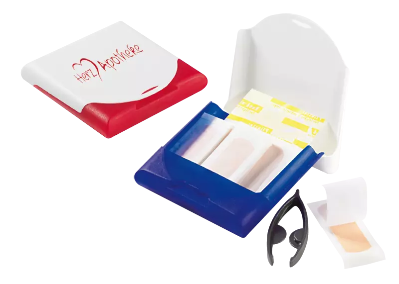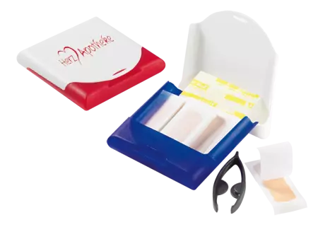 Les étuis légers et solides en polypropylène sont faciles à emporter et se glissent dans n'importe quel sac ou poche de manteau. En cas d'urgence, ils peuvent s'ouvrir avec une seule main. Ils contiennent différents pansements fabriqués en Allemagne (conformément aux directives européennes). Contrairement à de nombreux produits du commerce, les pansements sont recouverts non pas de film, mais de papier.