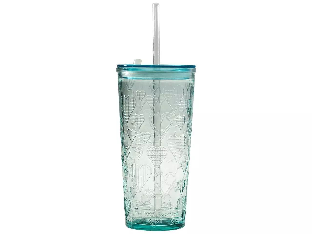 Adoptez le verre "Heart to go" pour réduire votre empreinte carbone ! Pour sa fabrication, le verre recyclé requiert moins d'énergie, réduisant de 20 à 30% les émissions de CO2. Ses jolis motifs en forme de cœurs et son couvercle muni d'une paille sauront vous séduire. Contenance 0,5 l. Fabriqué en Espagne.